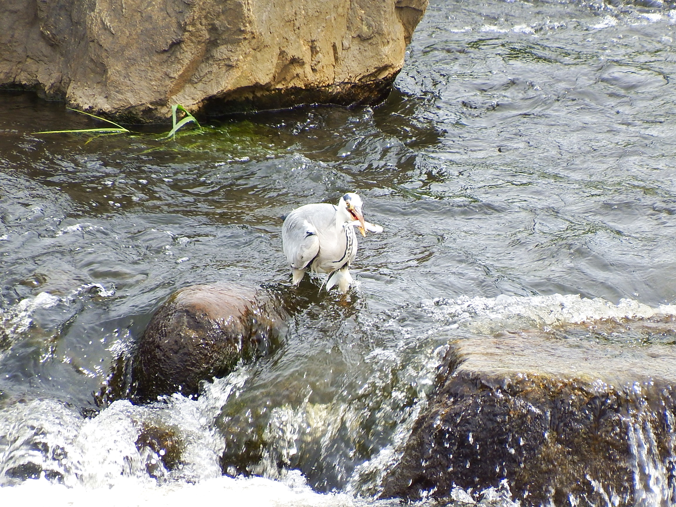 近所の二級河川で撮影しました。アオサギやカモメ、カルガモ、ハトが餌探しに飛来します。