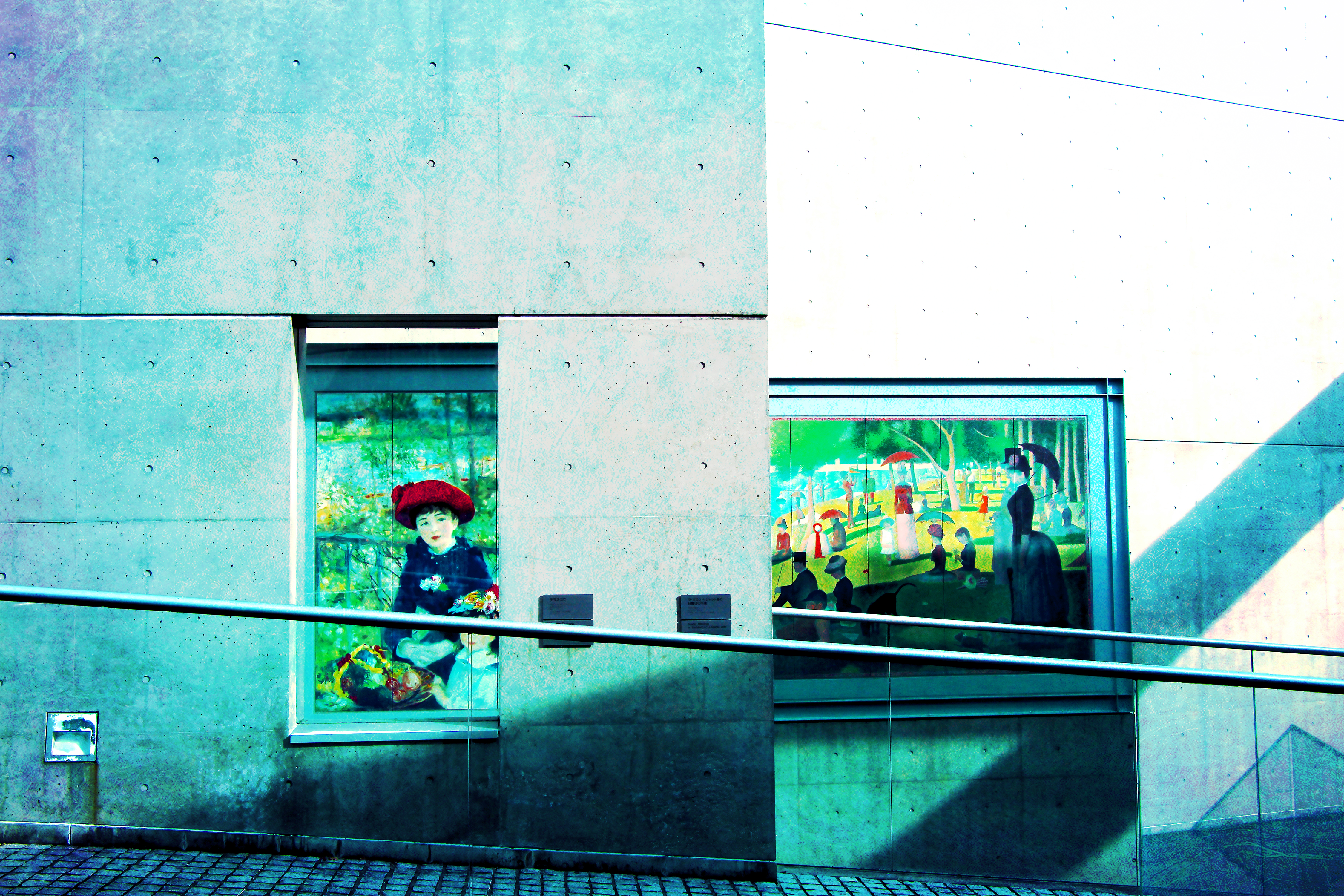 静の絵画の中に、その周りの影や斜めの手すりなど動的なイメージが映し出され、不思議な構図を写せました。