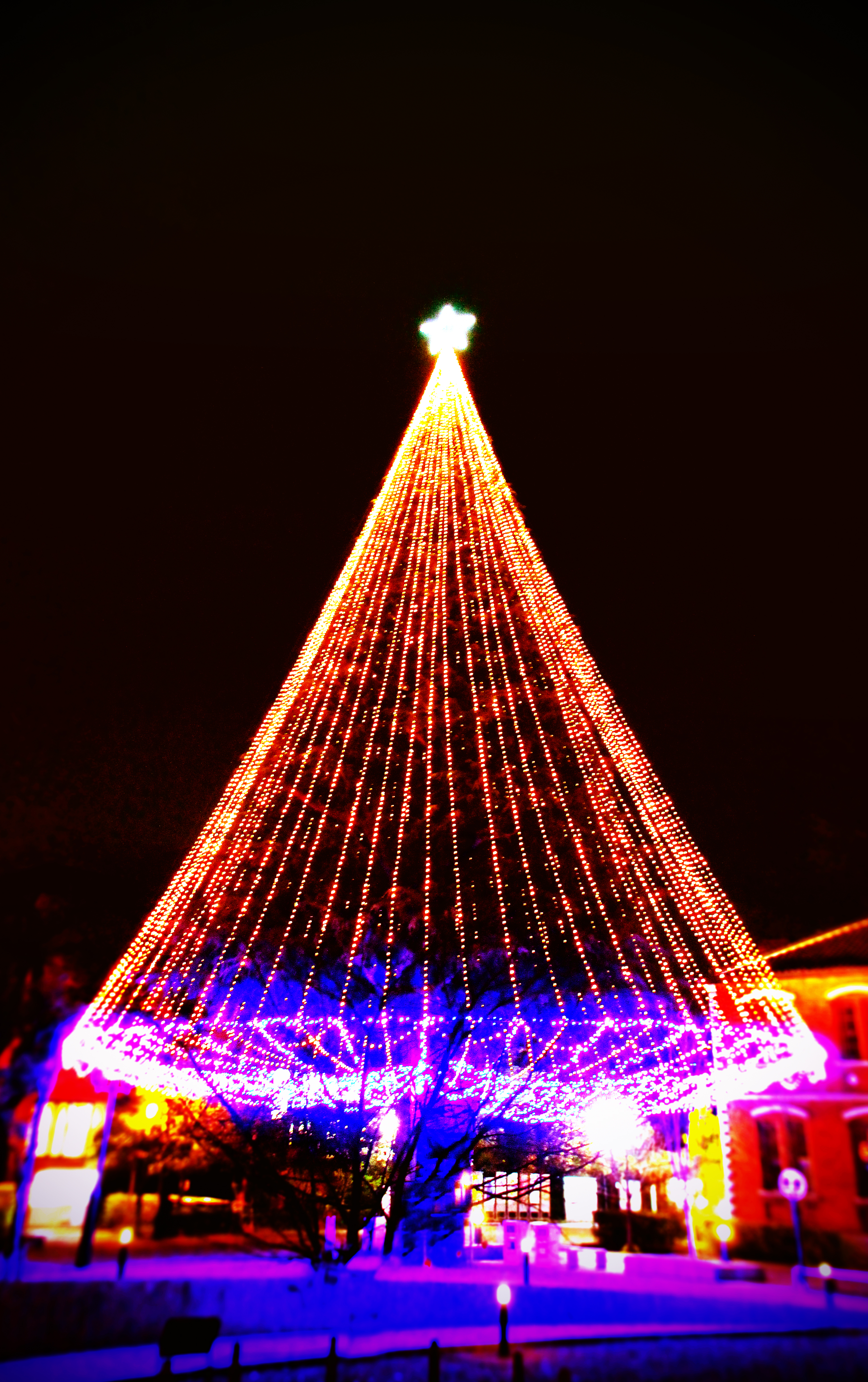 自然の大きな木に電飾を輝くその光景は、心が純真な気持ちになり、落ち着いた光景であります。