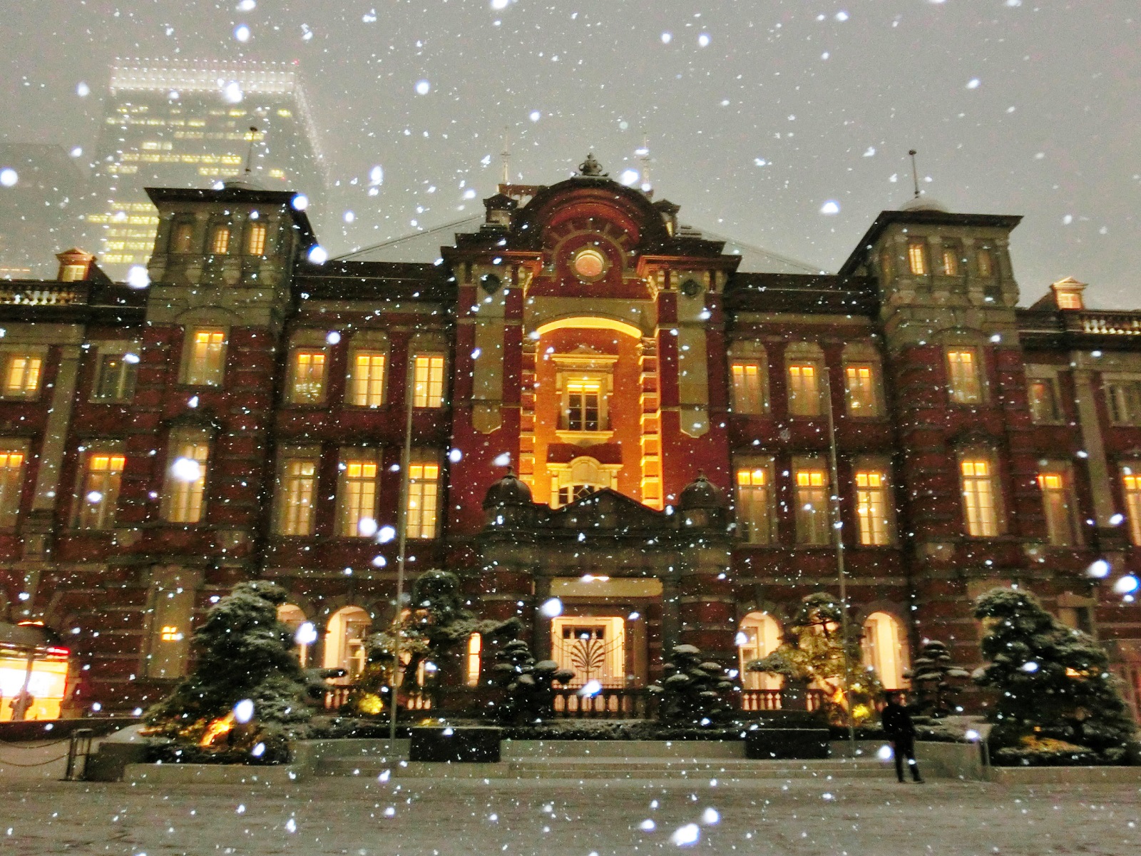 東京駅に降雪過去にも見たことがありません。