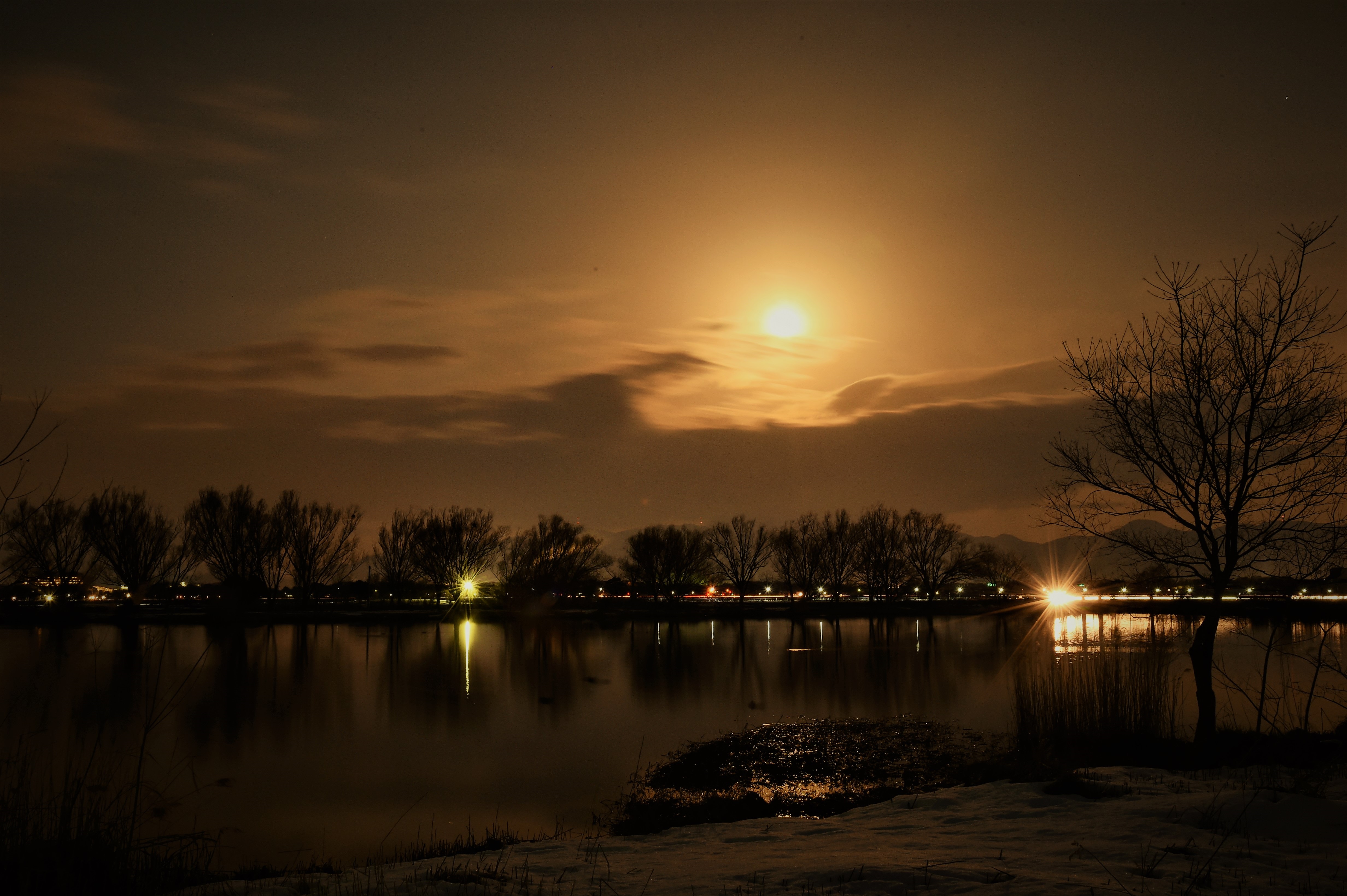 満月の光を頂点に人工の光と不思議なトライアングルが出来ました。