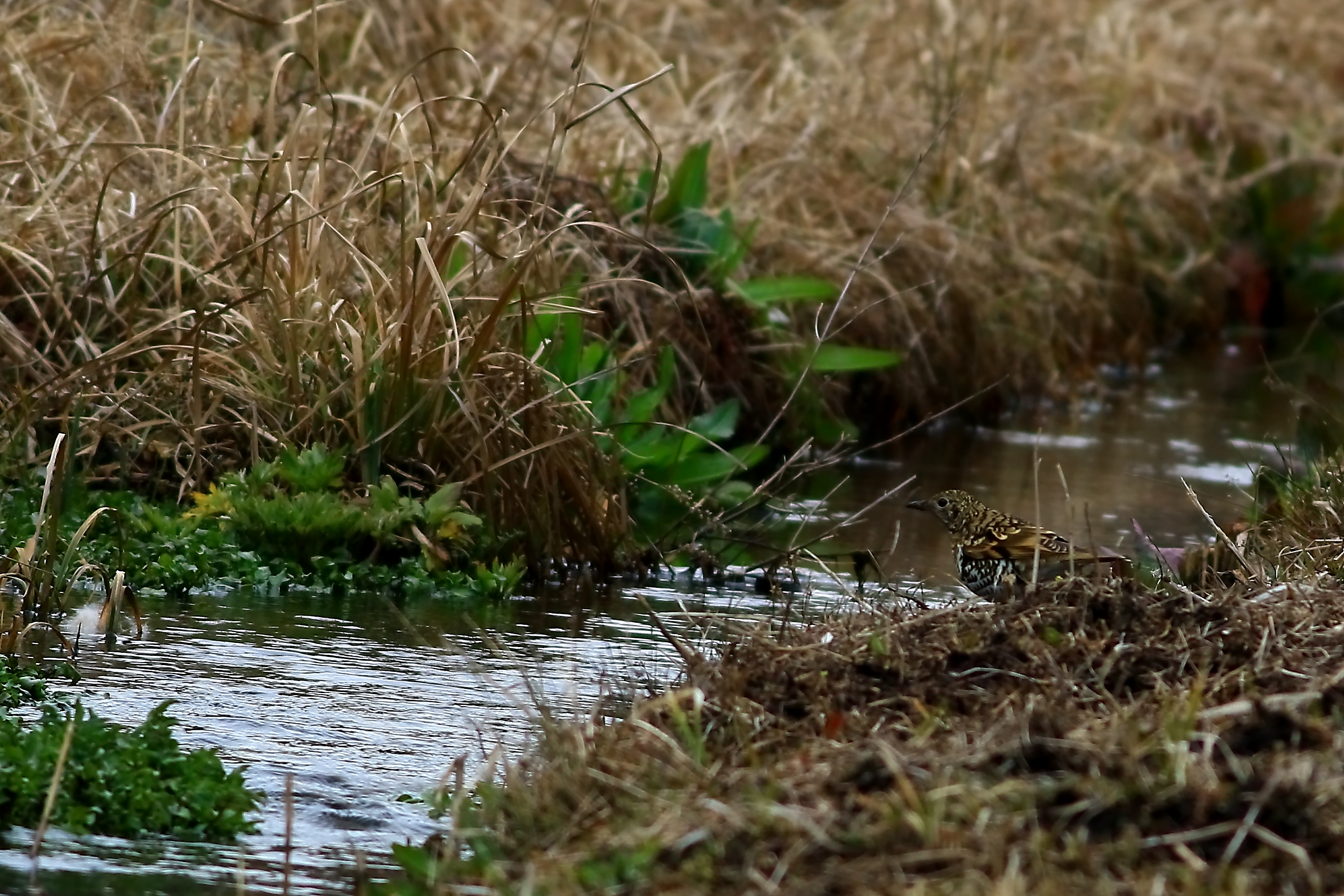 森林性で雑木林などの暗い地面で落ち葉などをかき分けミミズや昆虫を漁るトラツグミ。野原で体を揺すって地中のミミズをおびき出す「トラダンス」に夢中になり、いつの間にか水辺(画面右)にやってきました。水浴びでもしてくれればと期待しましたが暫し立ち止まった後、回れ右をしてまたトラダンスに夢中でした。水辺のトラツグミ、初めて見る光景でした。