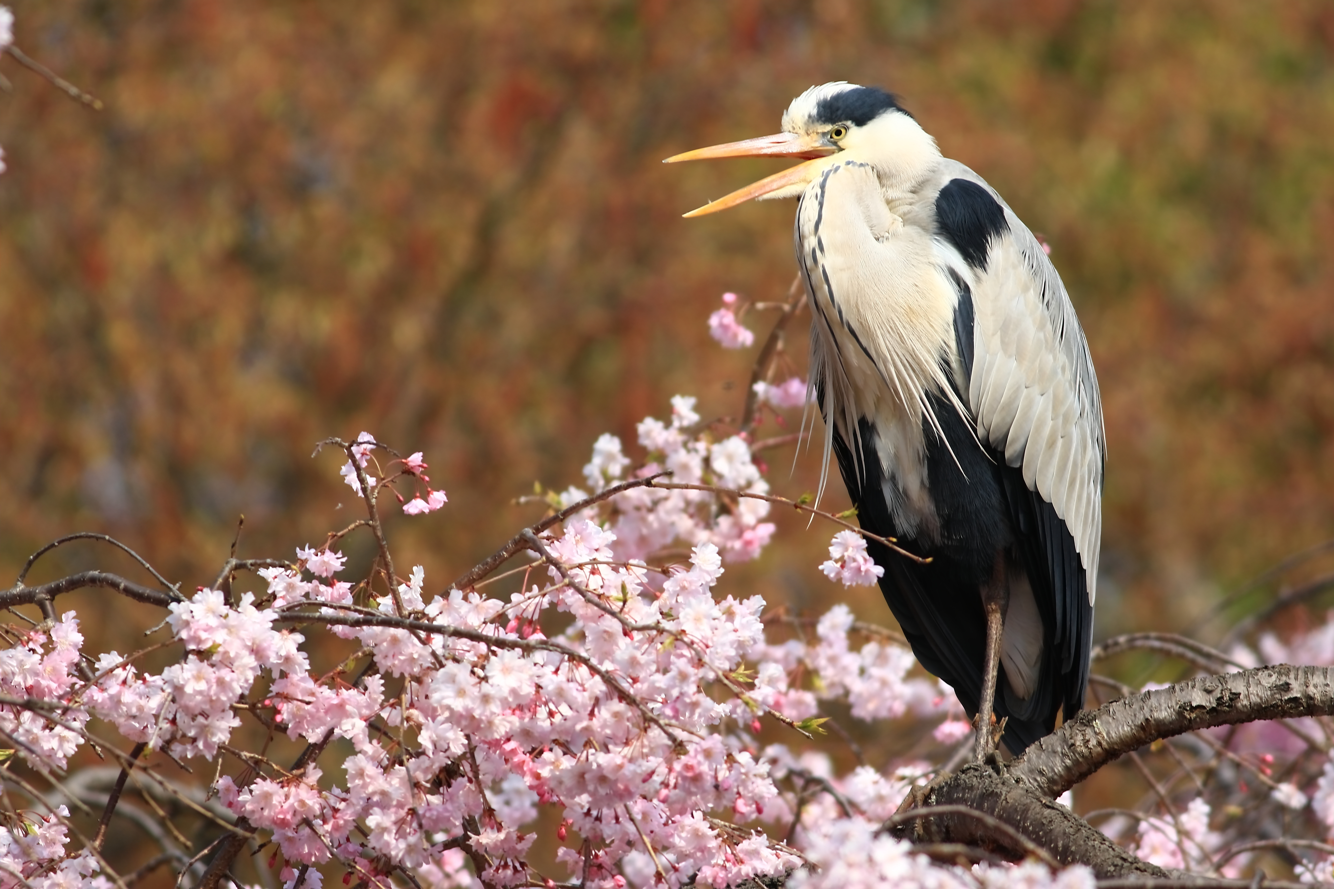満開の桜の木を見上げると天辺に鷺の仲間では最大級、体長約95㎝のアオサギが悠々と止まっていました。