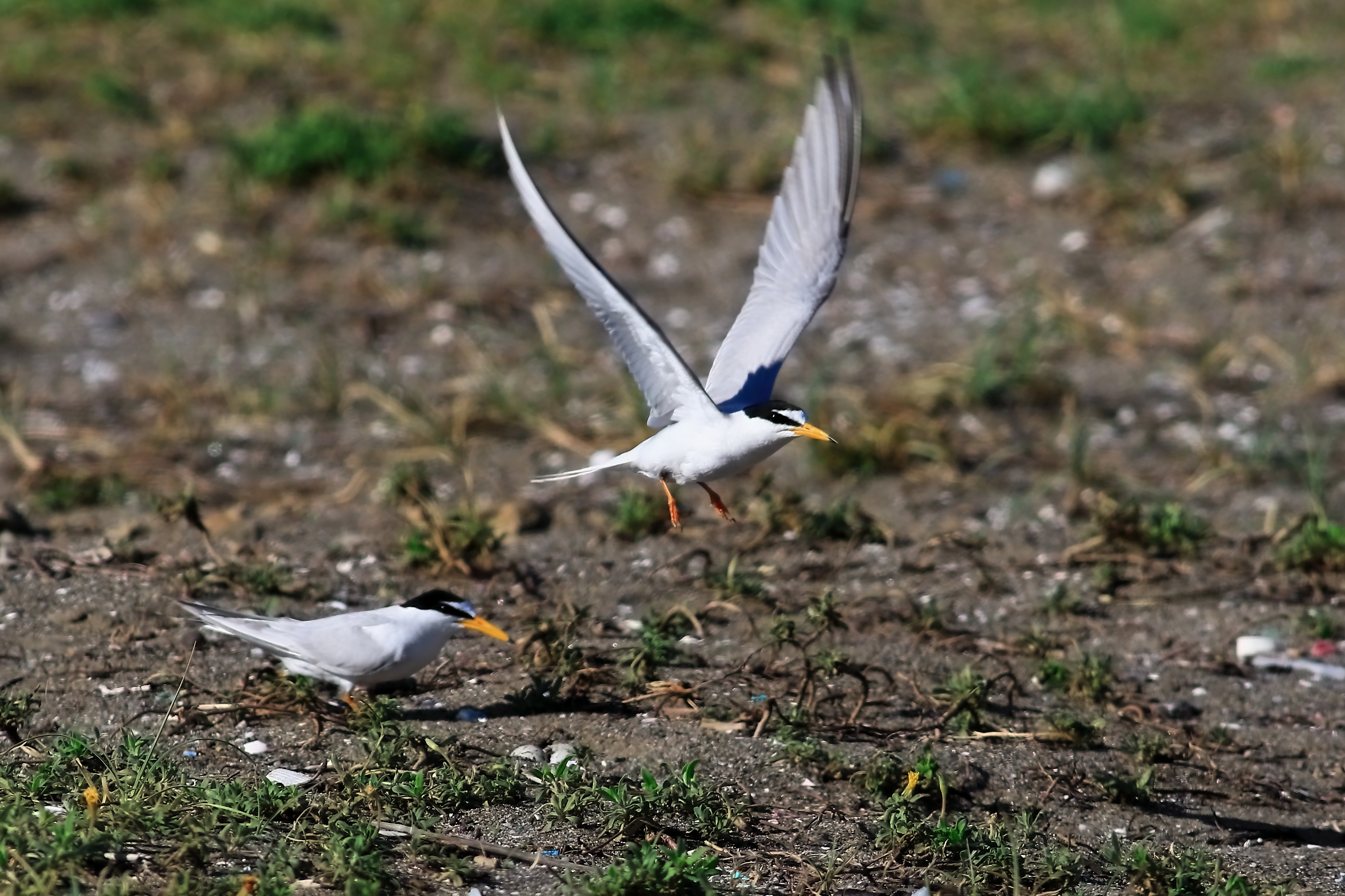 【コアジサシの抱卵:4連作の4】 雌の抱卵を後ろで見守っていた雄のコアジサシが突然飛び出すと、雌も続き揃って食事のために海に向かって飛び立ちました。一時巣の中は二つの卵だけになりました。大丈夫かな? 案の定1週間後に悲劇が起きました。4つあった筈の巣が何者かに壊されていたそうです。27日は日曜日、浜辺は潮干狩りやバーベキューで賑わいます。コアジサシは抱卵しても雛が育つのは10%以下という環境省の調査結果があります。人が環境づくりに手を貸してもこのような場所しかないのです。時間がない中、急遽関係者が再度環境整備を行ったようですが、コアジサシは再度応えてくれるでしょうか・・・。本シリーズは残念な結末で終わりますが、また機会があればアップしたいです。皆様ありがとうございました。
