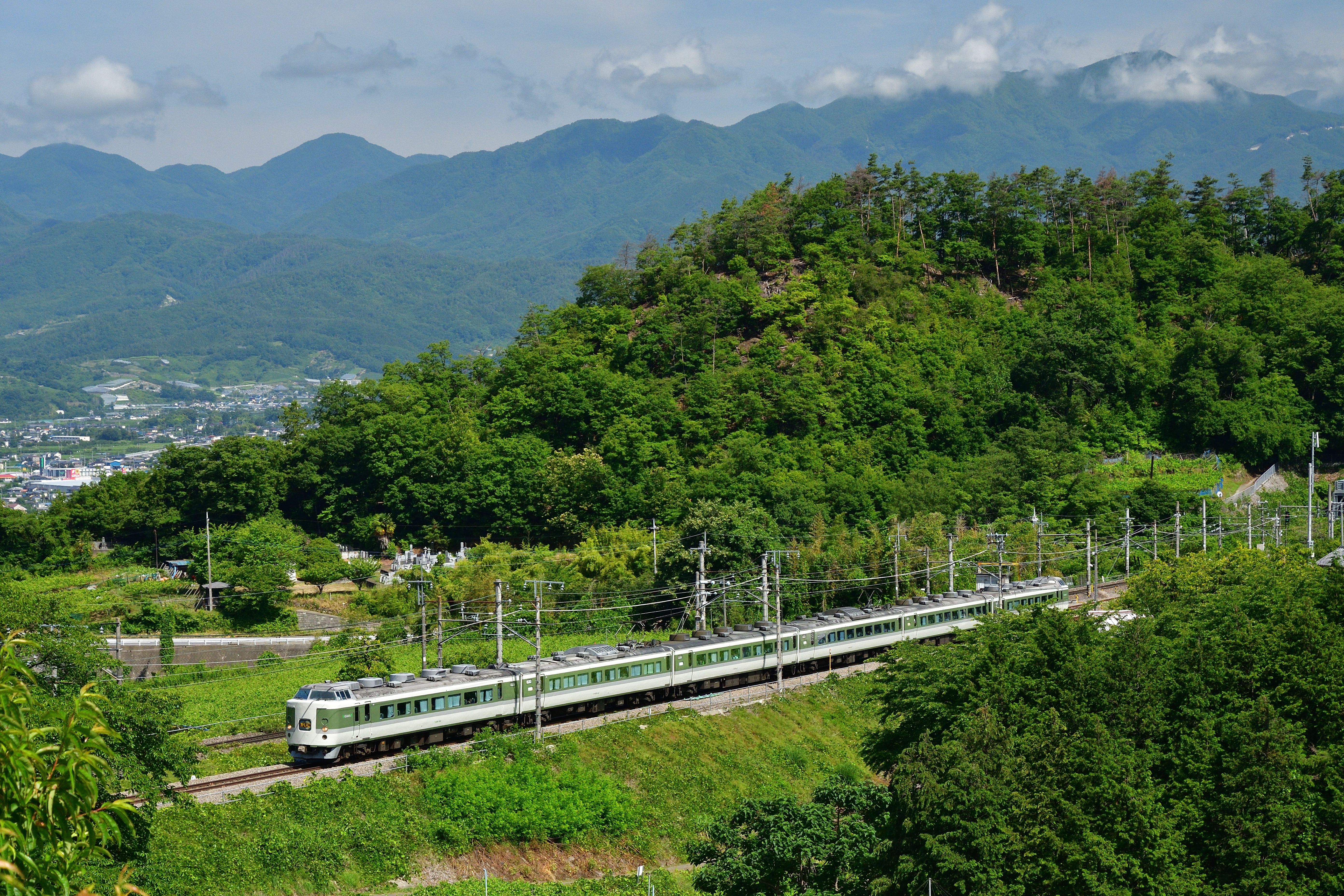 旧国鉄時代の特急用車両189系唯一の生き残りであるN102編成が、中央線「特急かいじ」として走る日に、緑ラインの車体が緑の中を走る姿を撮りました。