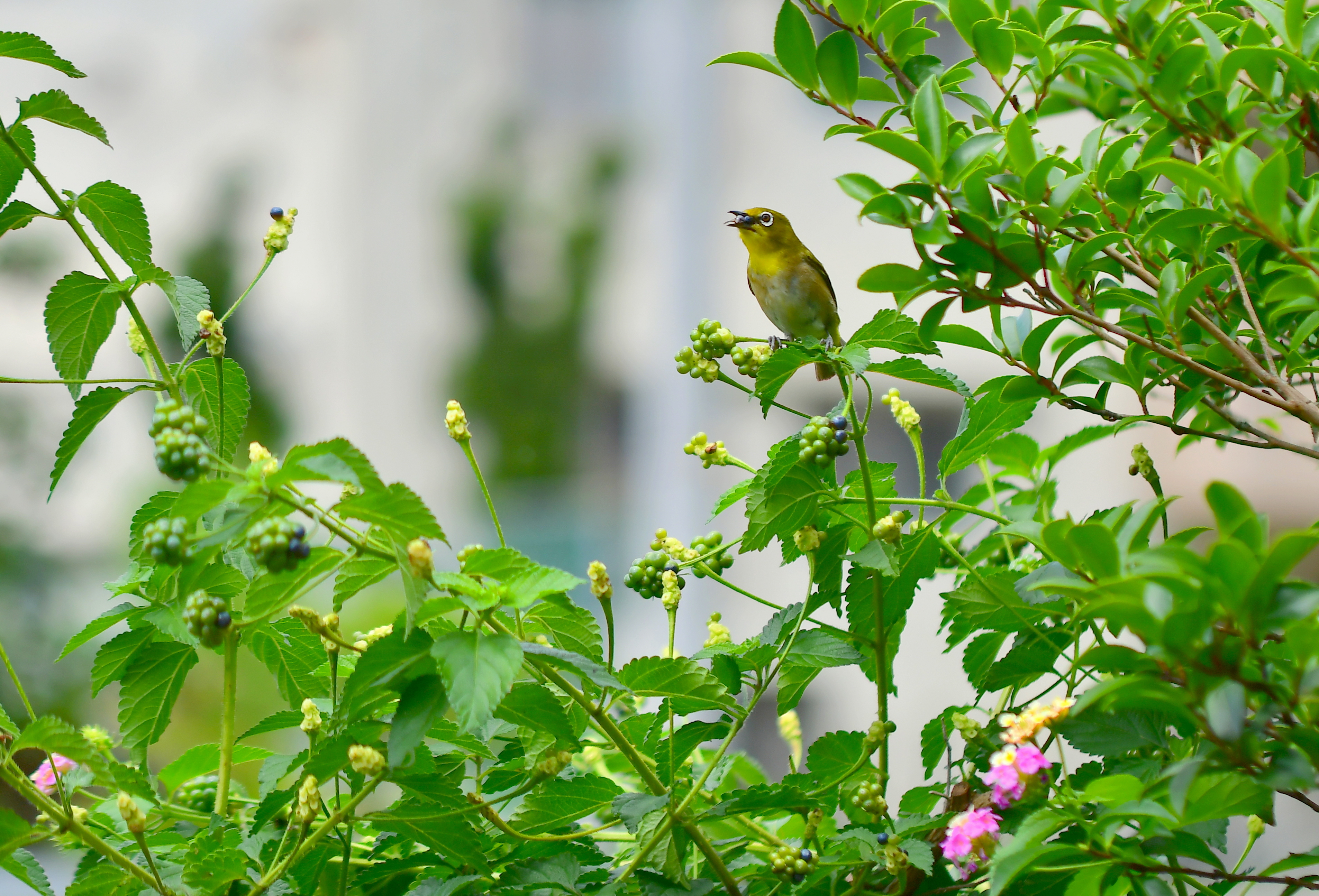 庭のランタナの花にやって来るのは蝶類ばかりでしたが、このところその実を食べに様々な野鳥たちがやって来るようになりました。