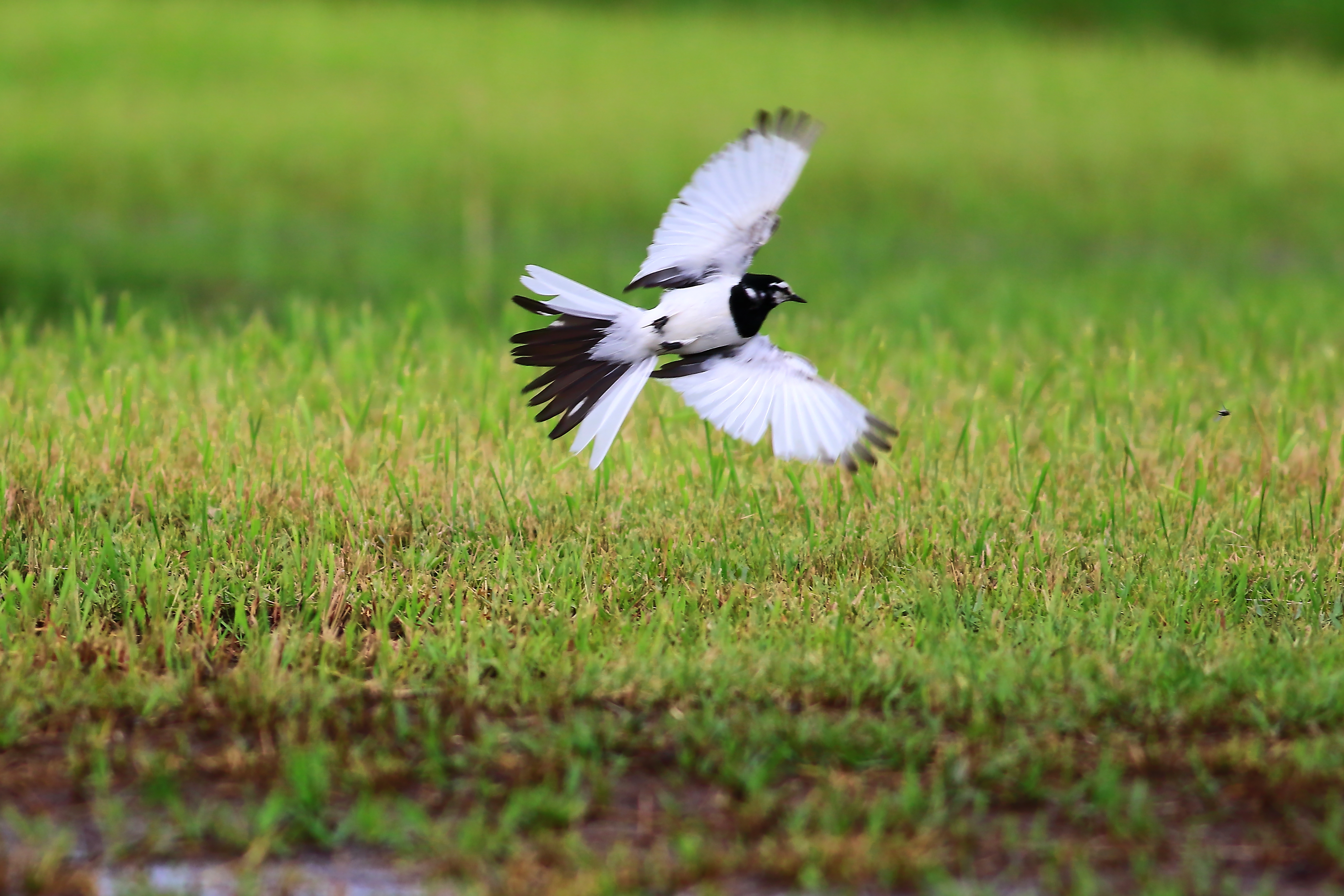 草原で休んでいたセグロセキレイがいきなり飛び出しました。視線の先(画面右隅)には小さな虫が