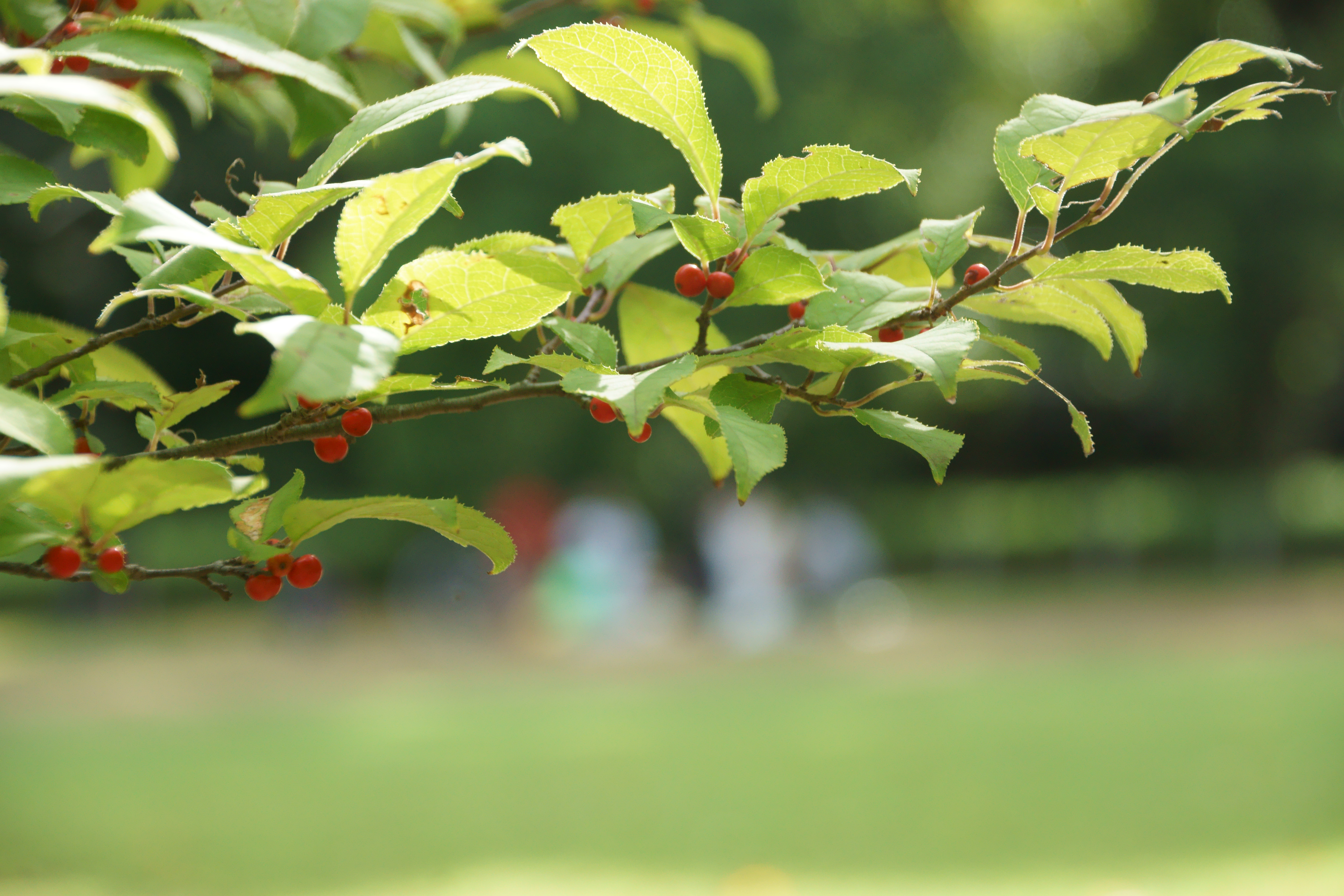 公園の林の中の赤い実のなる枝の向こうの芝生の上では、若いお母さんと小さな子供たちがピクニックをしていました。