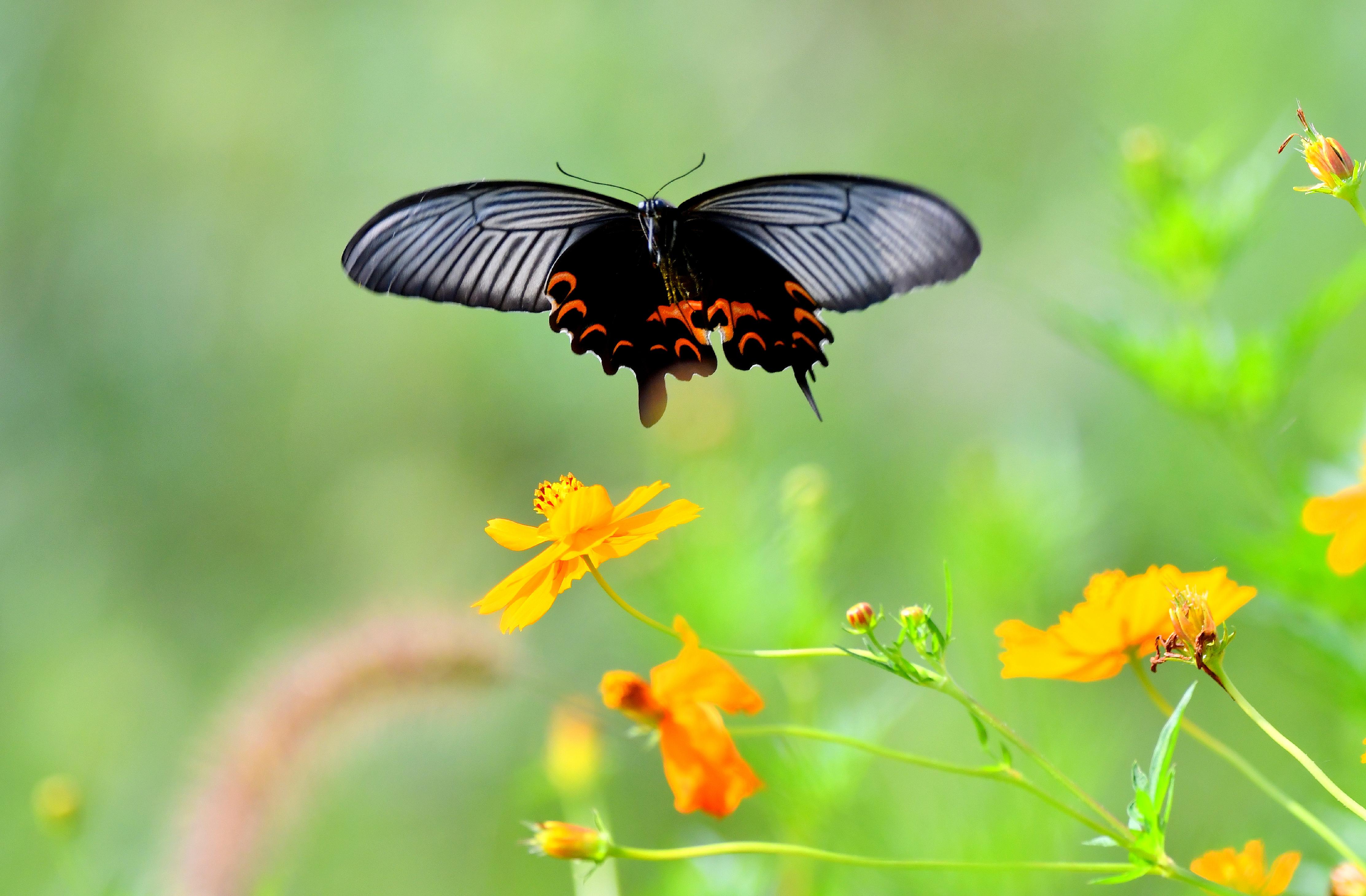キバナコスモスに来たクロアゲハ、蝶ってランダムな動きをしますが目的は花の蜜ですから辛抱強く待てば戻ってくることが多いのでこんなシーンにも遭遇します。