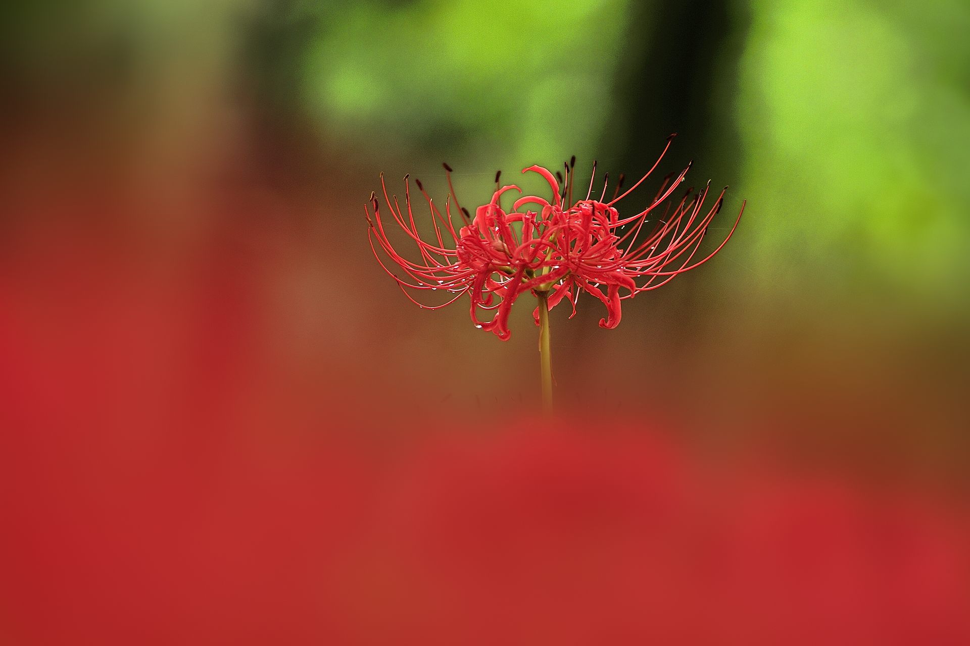 遊歩道からなので望遠マクロ風に撮ってボケを多くしました。下部の赤いところはRAW現像時にボケを増やしています。