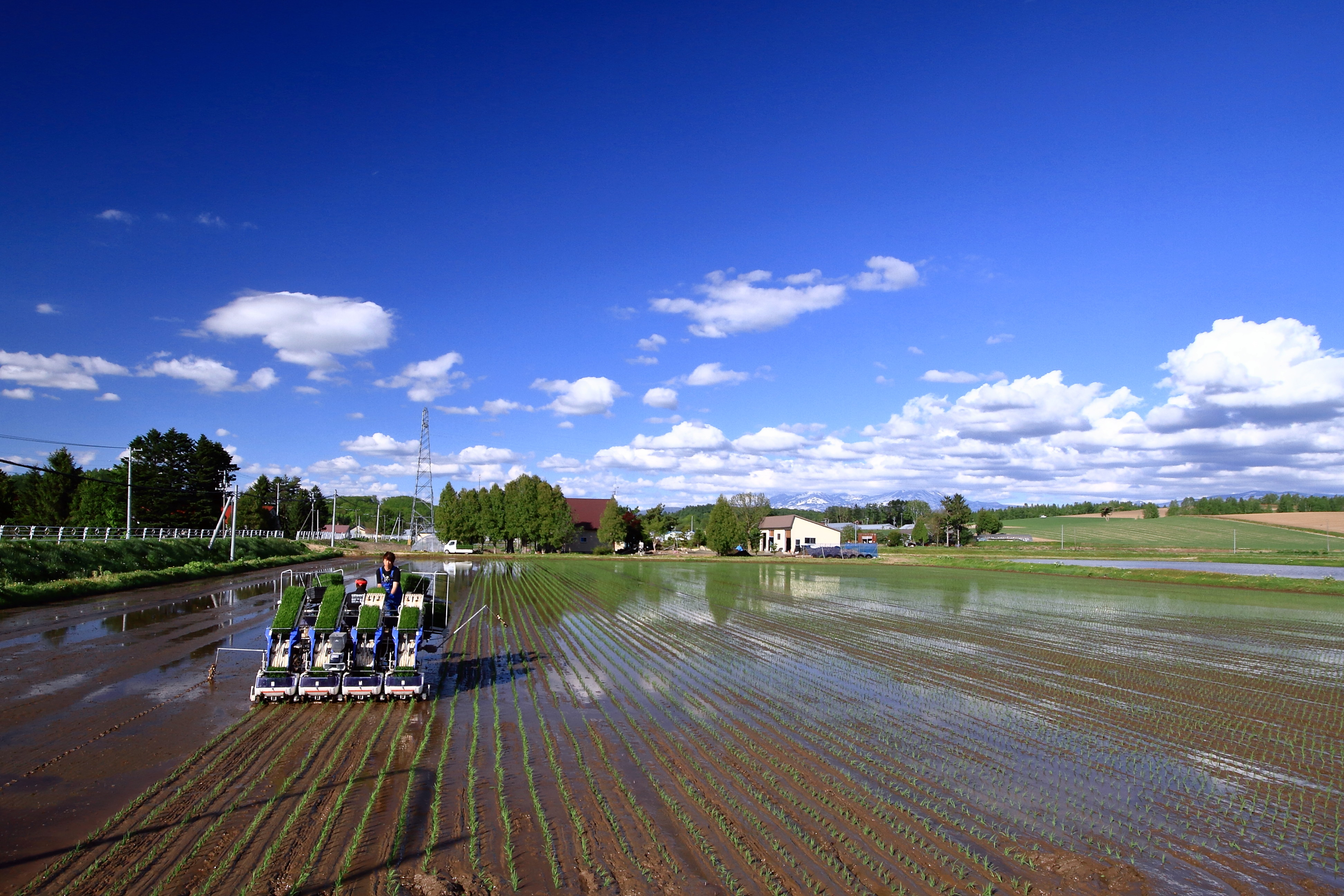 美瑛町で田植えと出会った。田んぼには写りか・・・