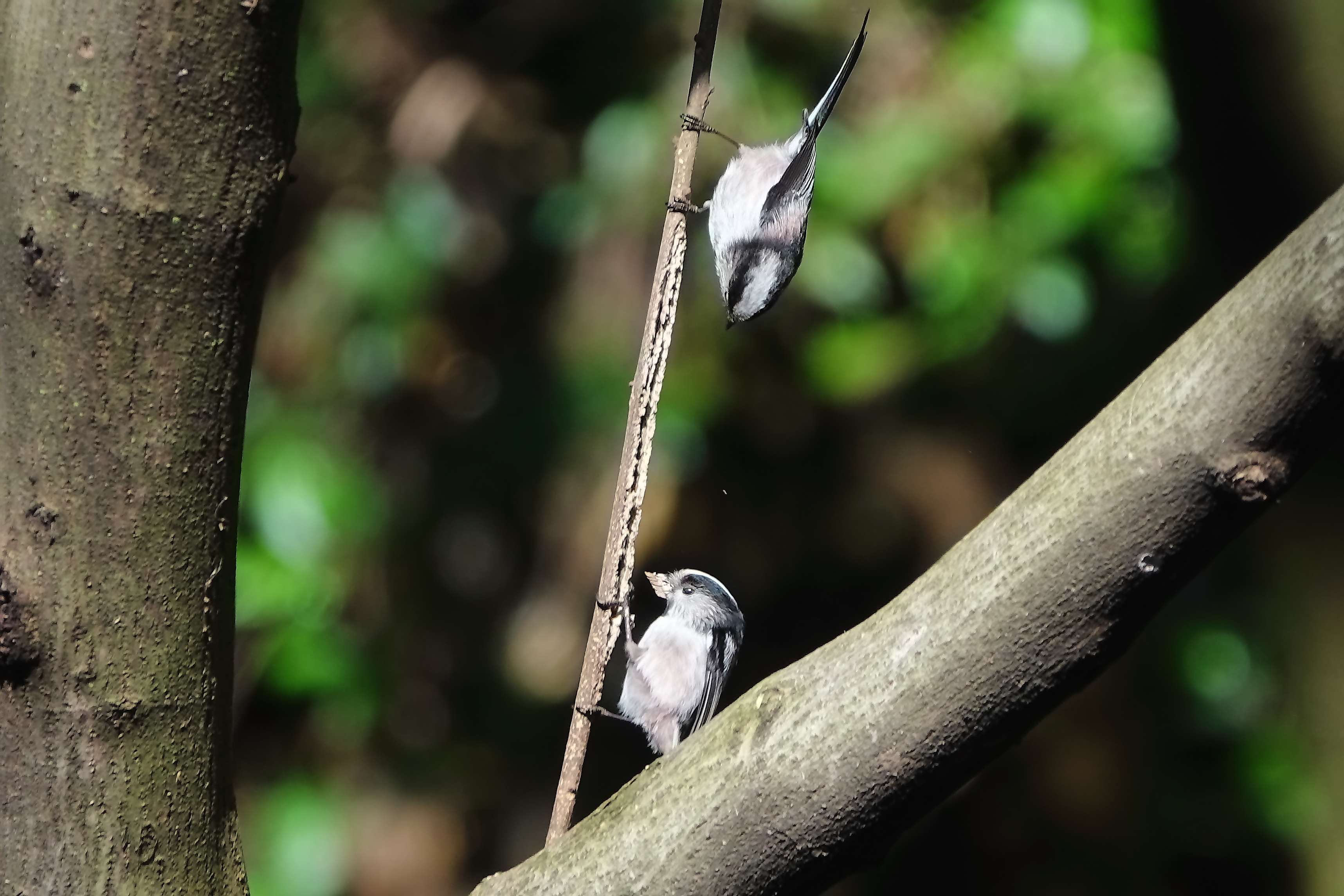 画面下のエナガが盛んに木の皮を剥がして中の虫を食べていると、もう1羽が