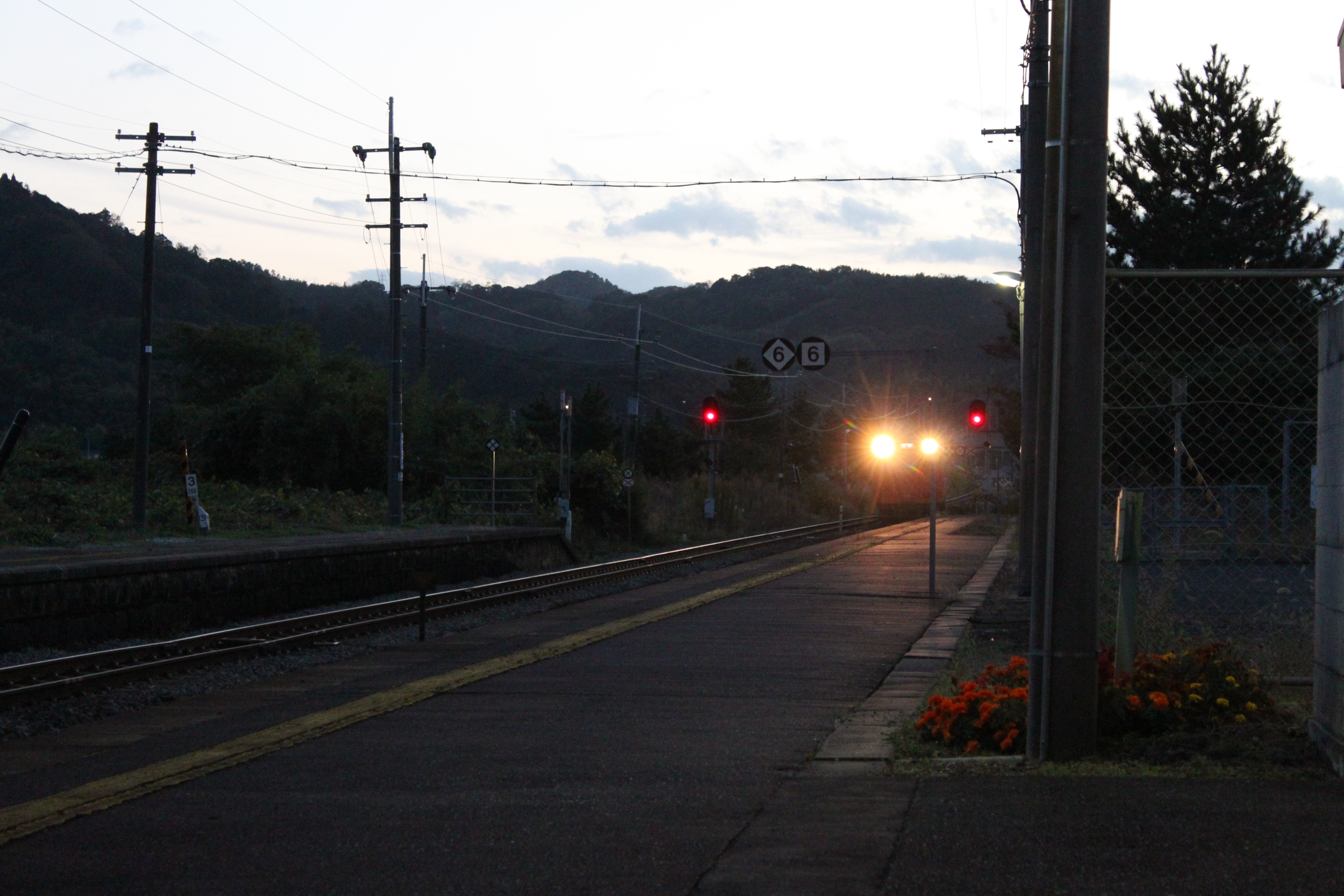 鉄道旅行。鳥取のとある駅。夕暮れ過ぎて、電車がまもなくやってきますー