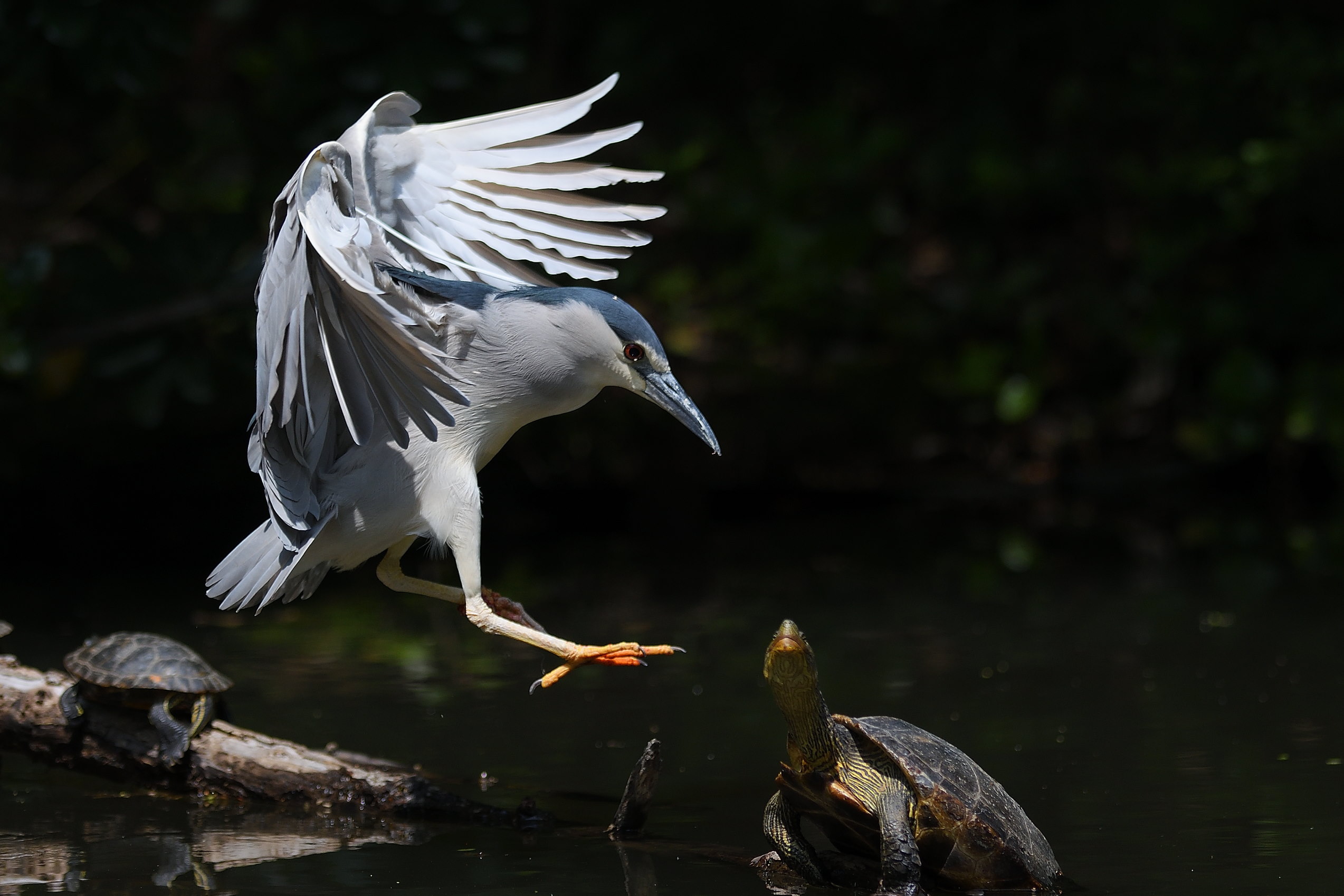 ゴイサギが急に降りて来たので、カメさんもビックリ。