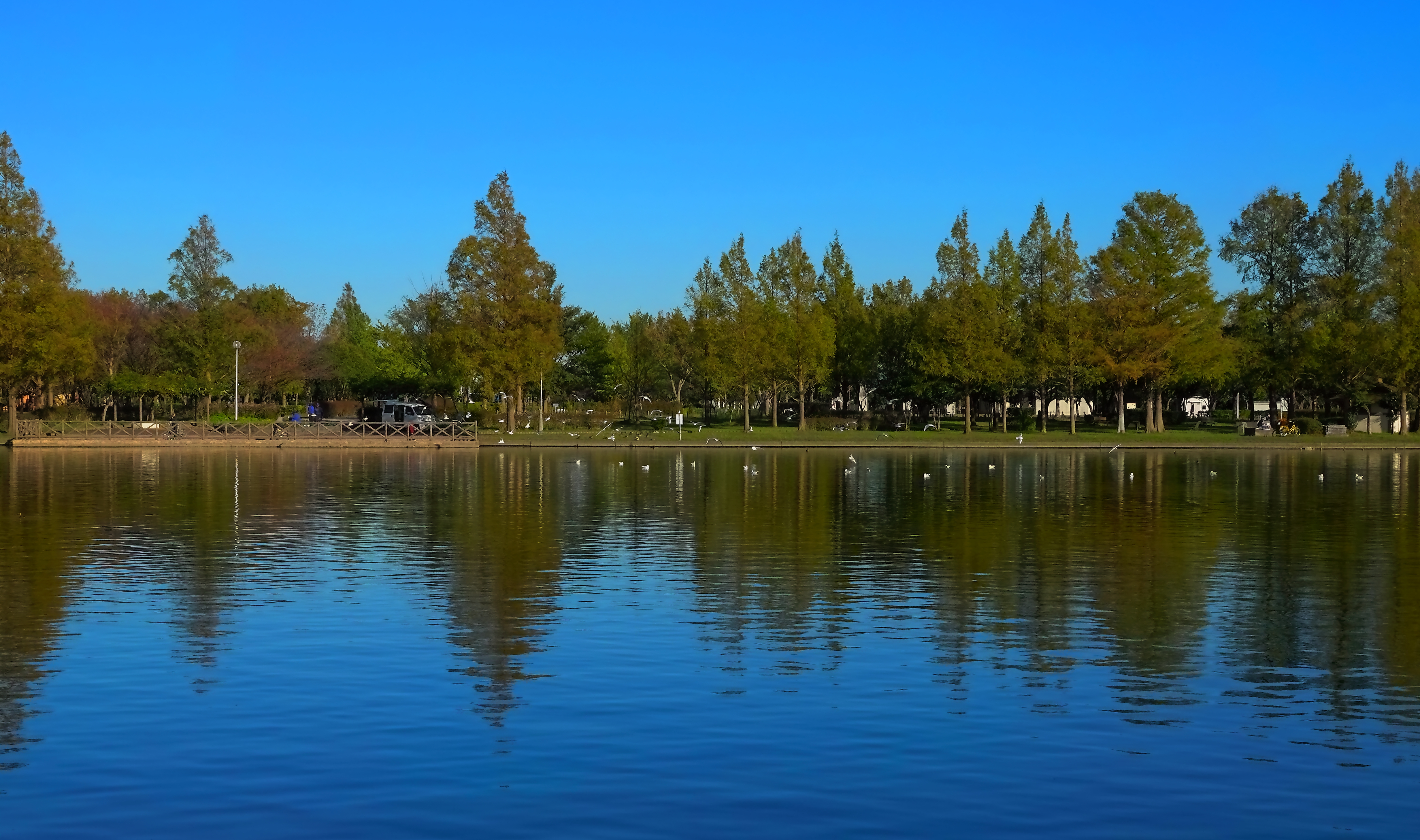 ユリカモメ飛ぶポプラ並木の池