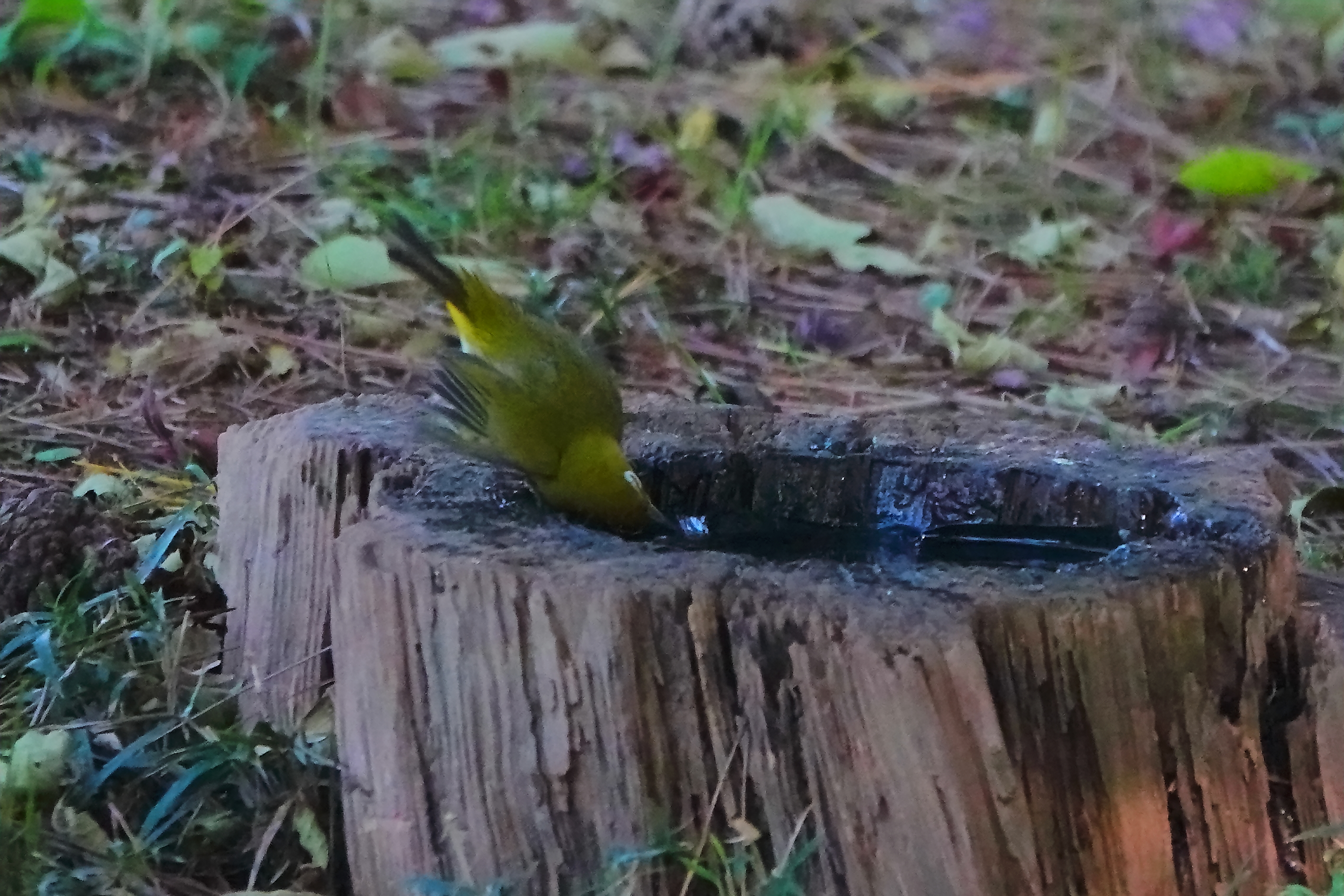 水を飲みに来たメジロ。こんな格好をしても届きそうもありません。