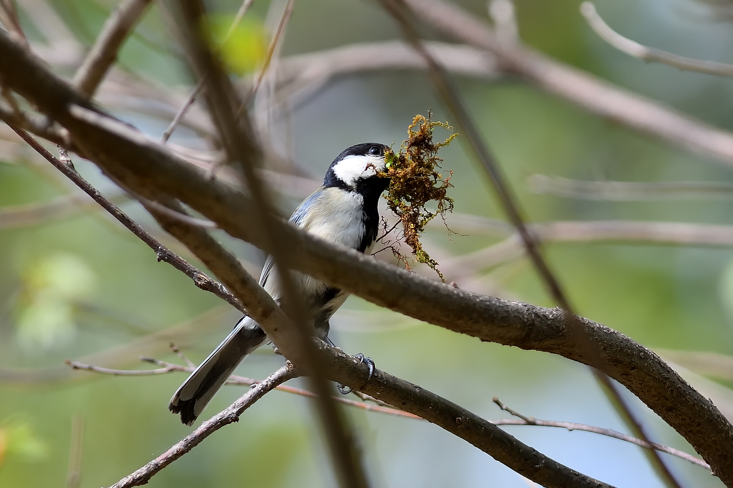 シジュウカラが、巣穴の中に敷く苔を咥えて孤軍奮闘中。