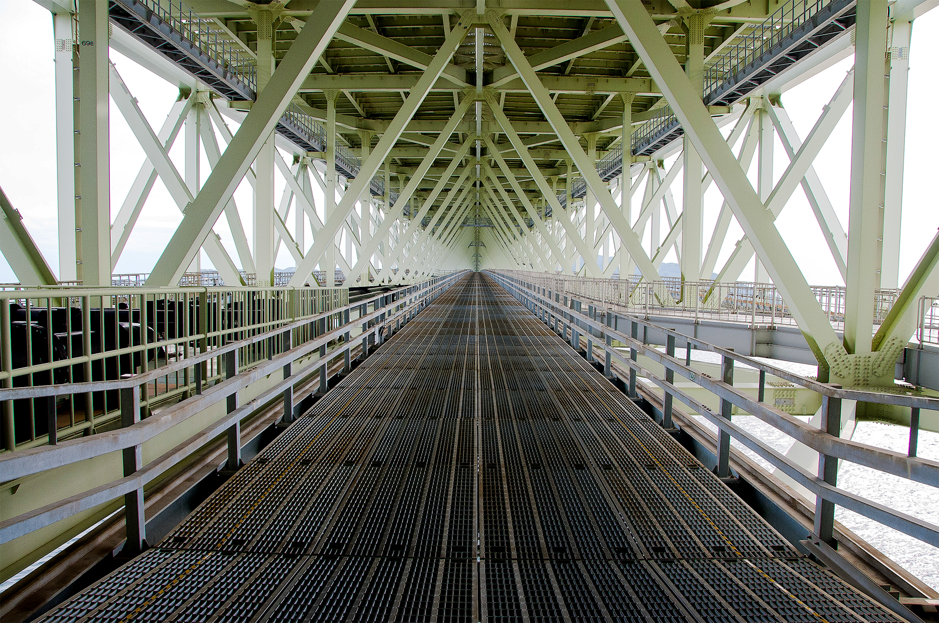 主塔に至る鋼材の道(管理用通路・主塔まで960m)、上が高速道です。