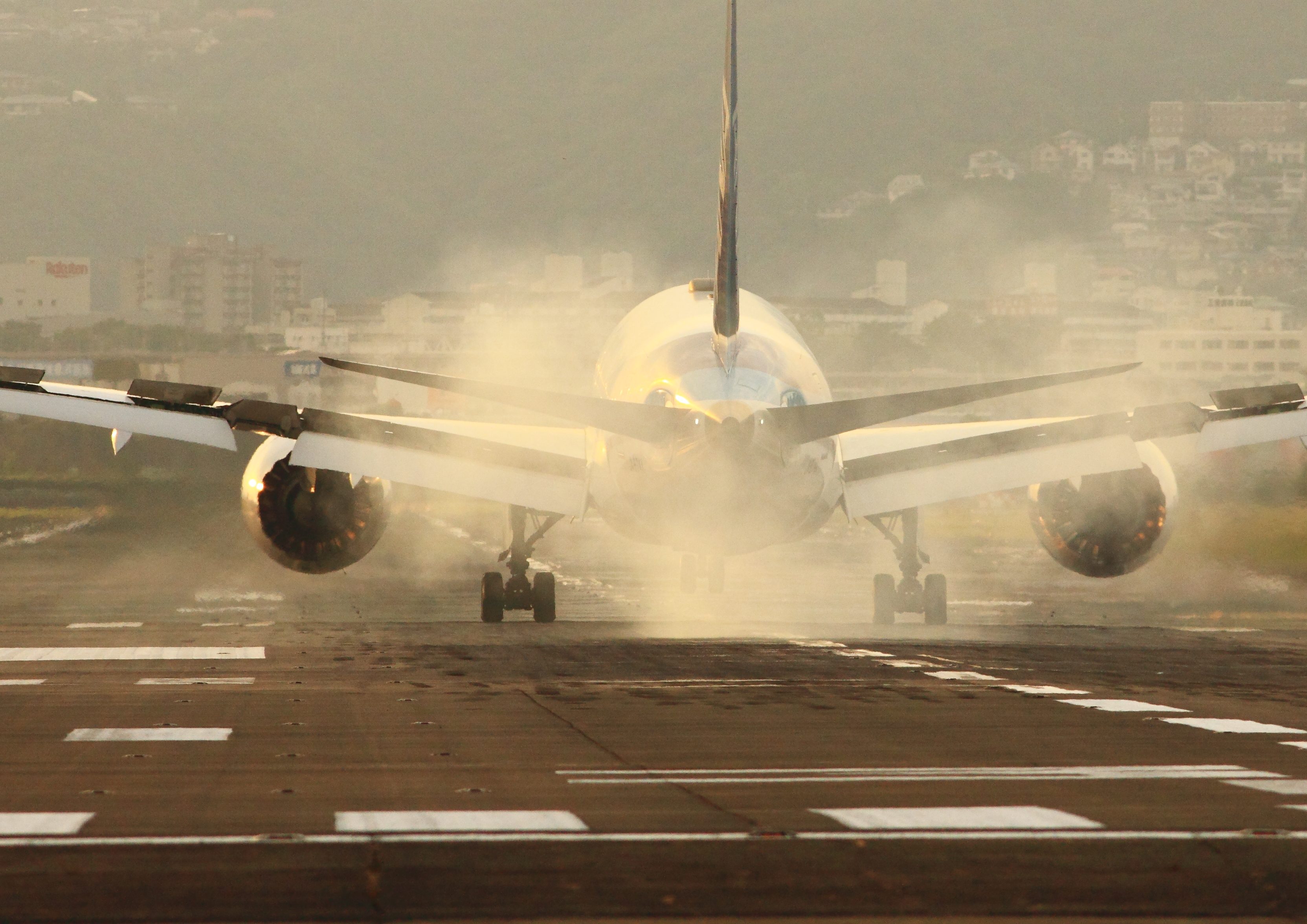 着陸した瞬間のタイヤの白煙です。夕陽 空港 滑走路 旅客機 タッチダウン