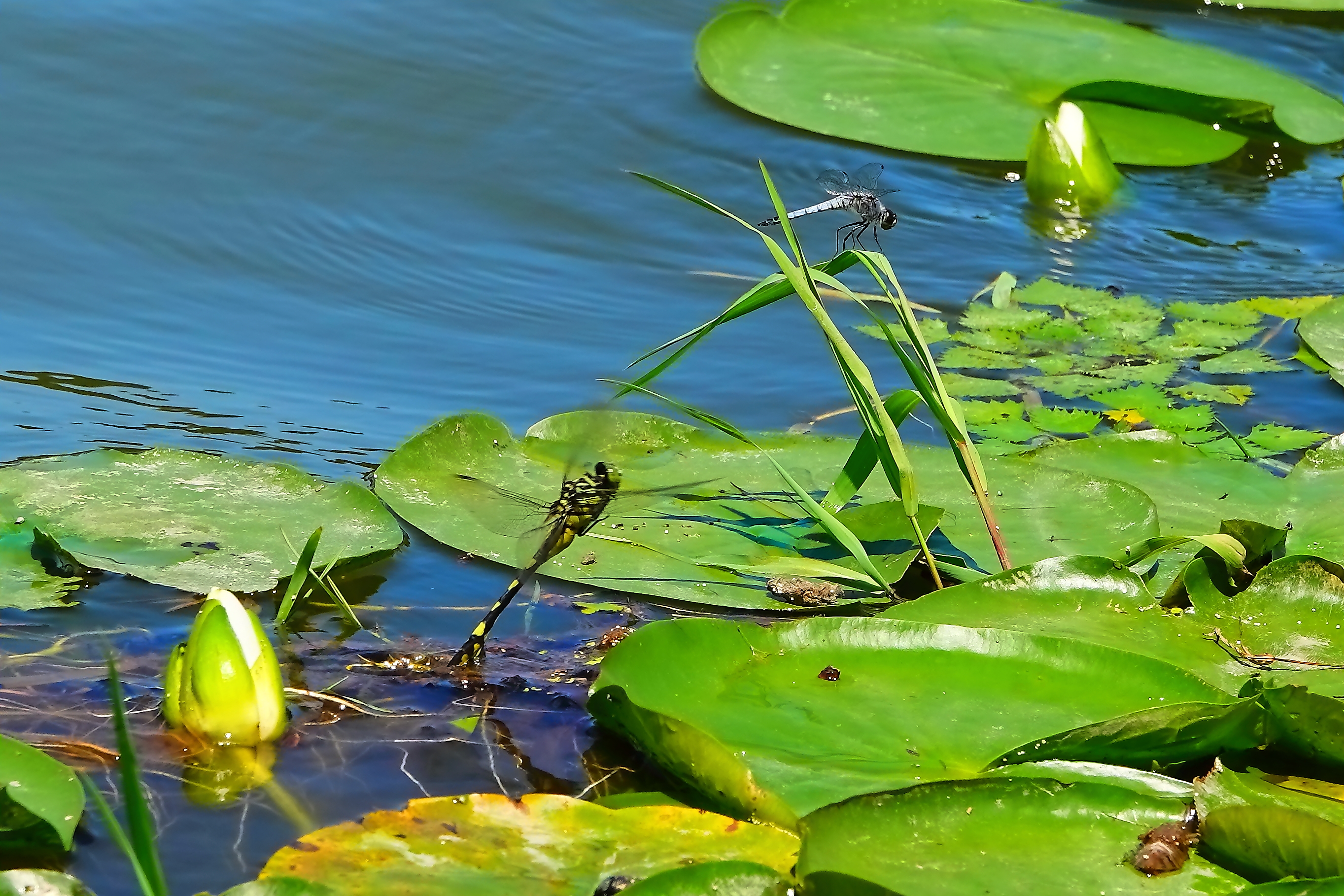 睡蓮に交尾飛翔してやって来たウチワヤンマのペア、交尾を終えて雌の単独産卵。