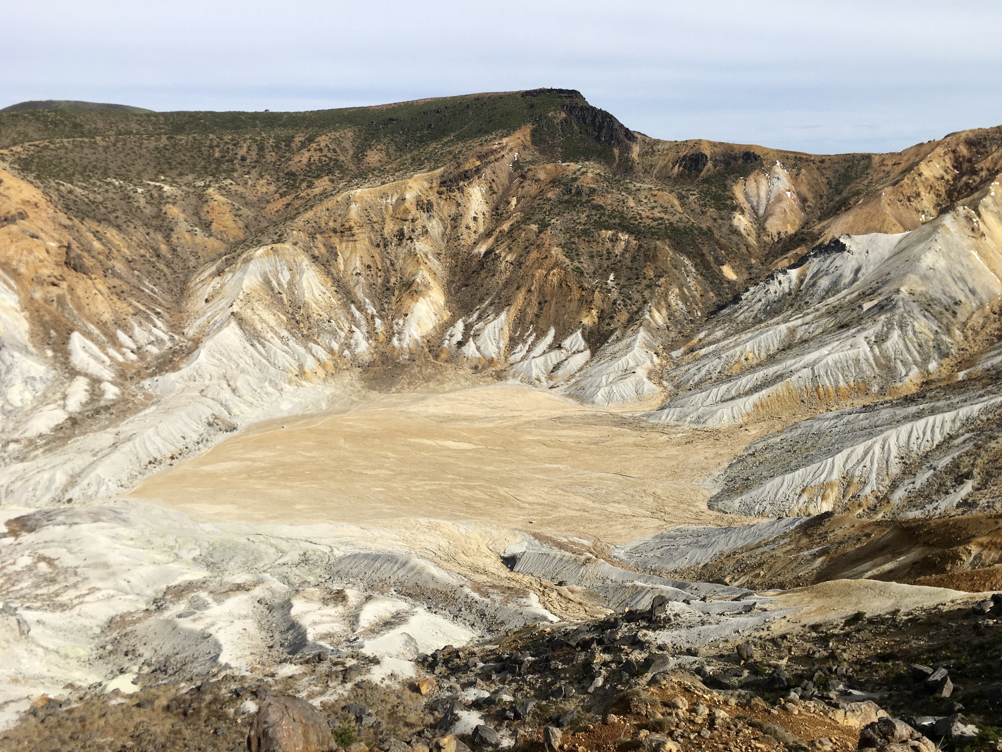 ここは安達太良山麓の中でも人気の撮影スポット、沼の平ですが、現在でも有毒ガスが時折り吹き出す異世界。月のクレーターを思わせる。直径約1㎞、深さ250mの大火口です。