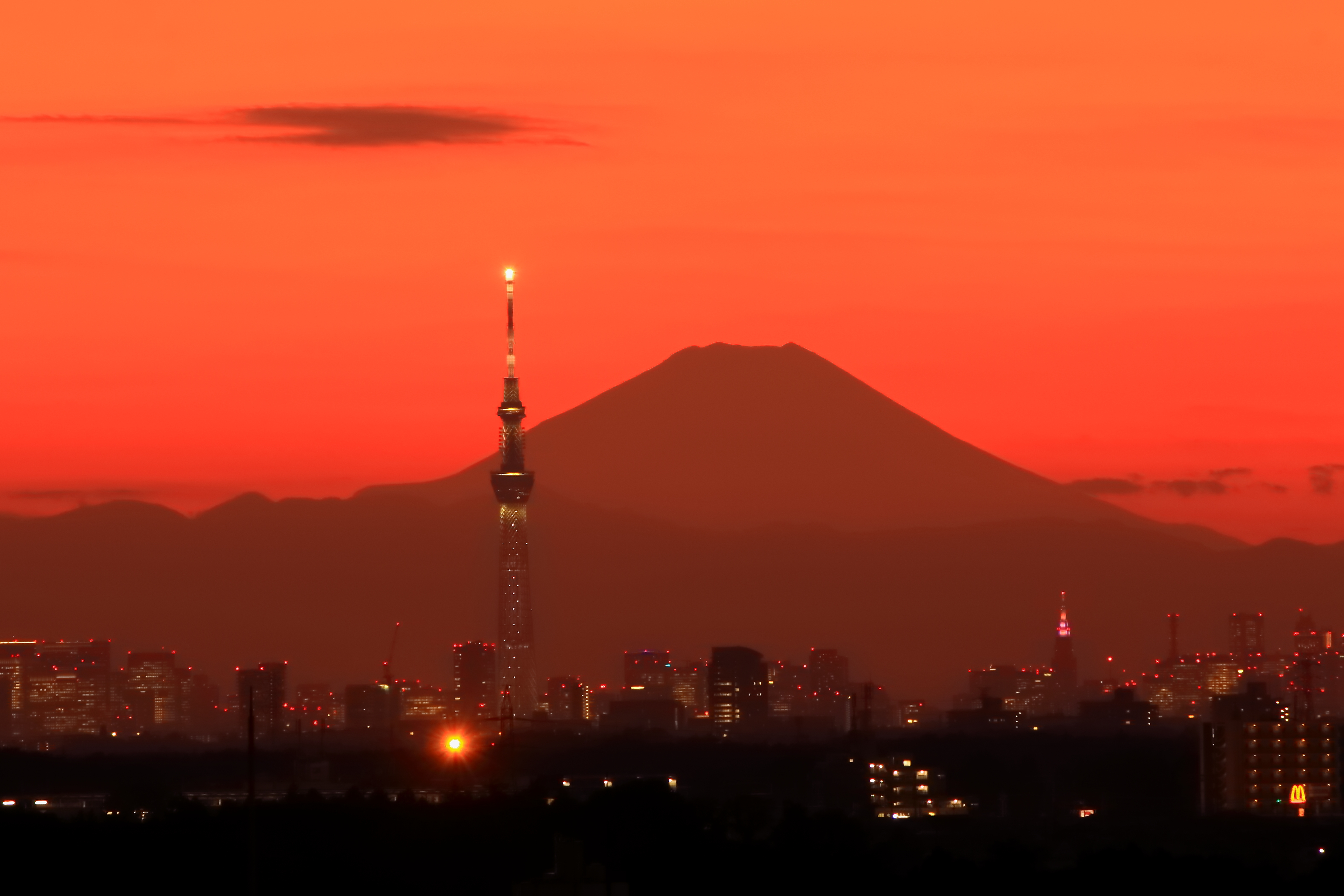 日の入り後30分程経過、夕空が赤く染まると富士山も茜色を帯びて来ました。