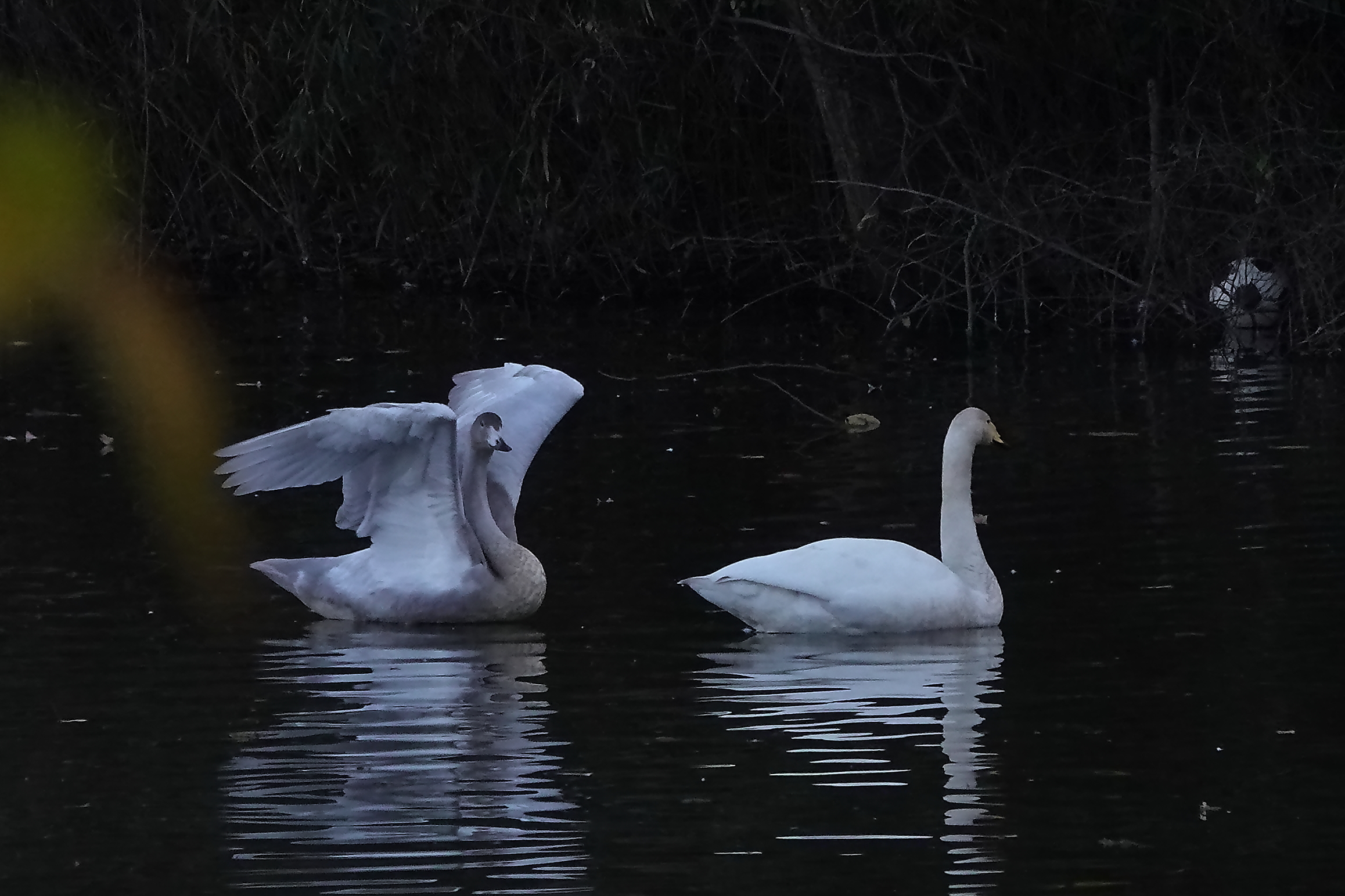 今年からボランティアさんによるオオハクチョウへの給餌がなくなった池、もう見られないと思い多くの人が諦めていましたが、何と昨25日に3週間ぶりに2羽の大白鳥が戻っていました。最後に飛び去った内の親子かもしれません。かなりの時間、揃って羽の間に首を突っ込み頭を上げることがありませんでした。通りがかる人々は心配で気をもんでいましたが、小一時間経って漸く幼鳥が元気に羽搏いてくれました(^▽^)/