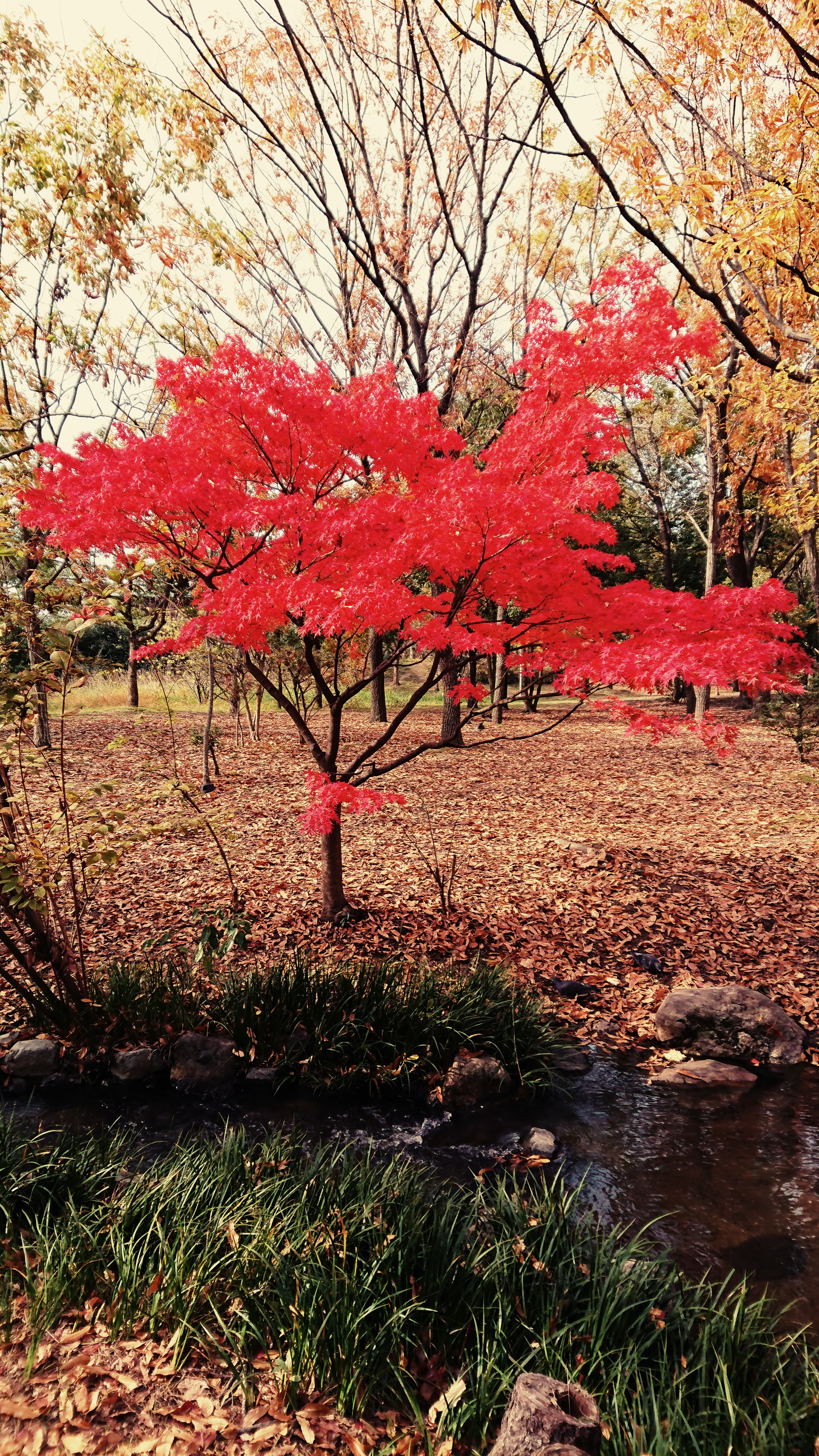 黄葉の中の一本木の緋色の木、
