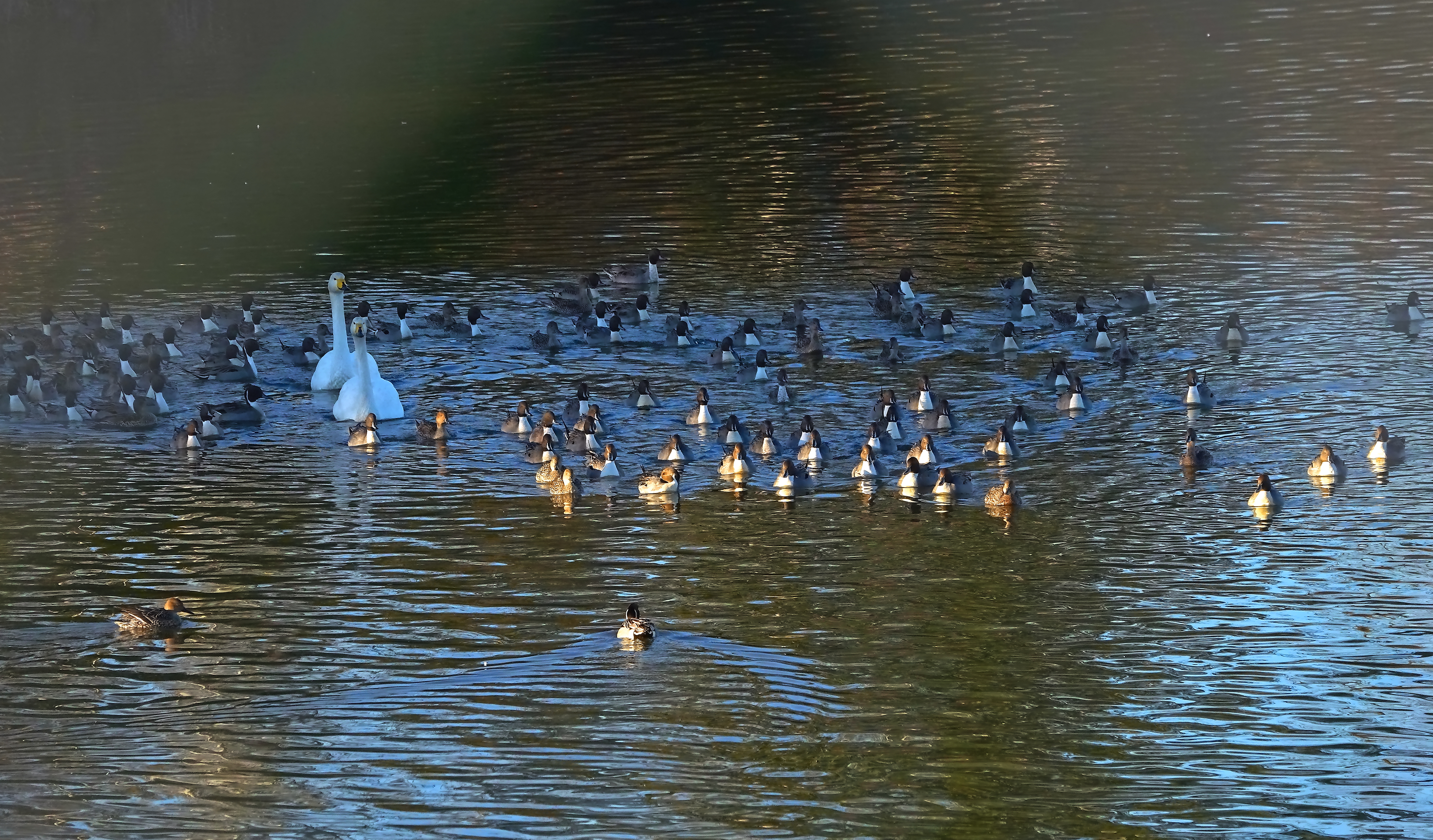 広い池のあちこちに散らばっていた鴨(主にオナガガモとホシハジロ)がいつの間にか一か所に集まってきました。一体どうしたのかな・・・。この後2作品が続きます。