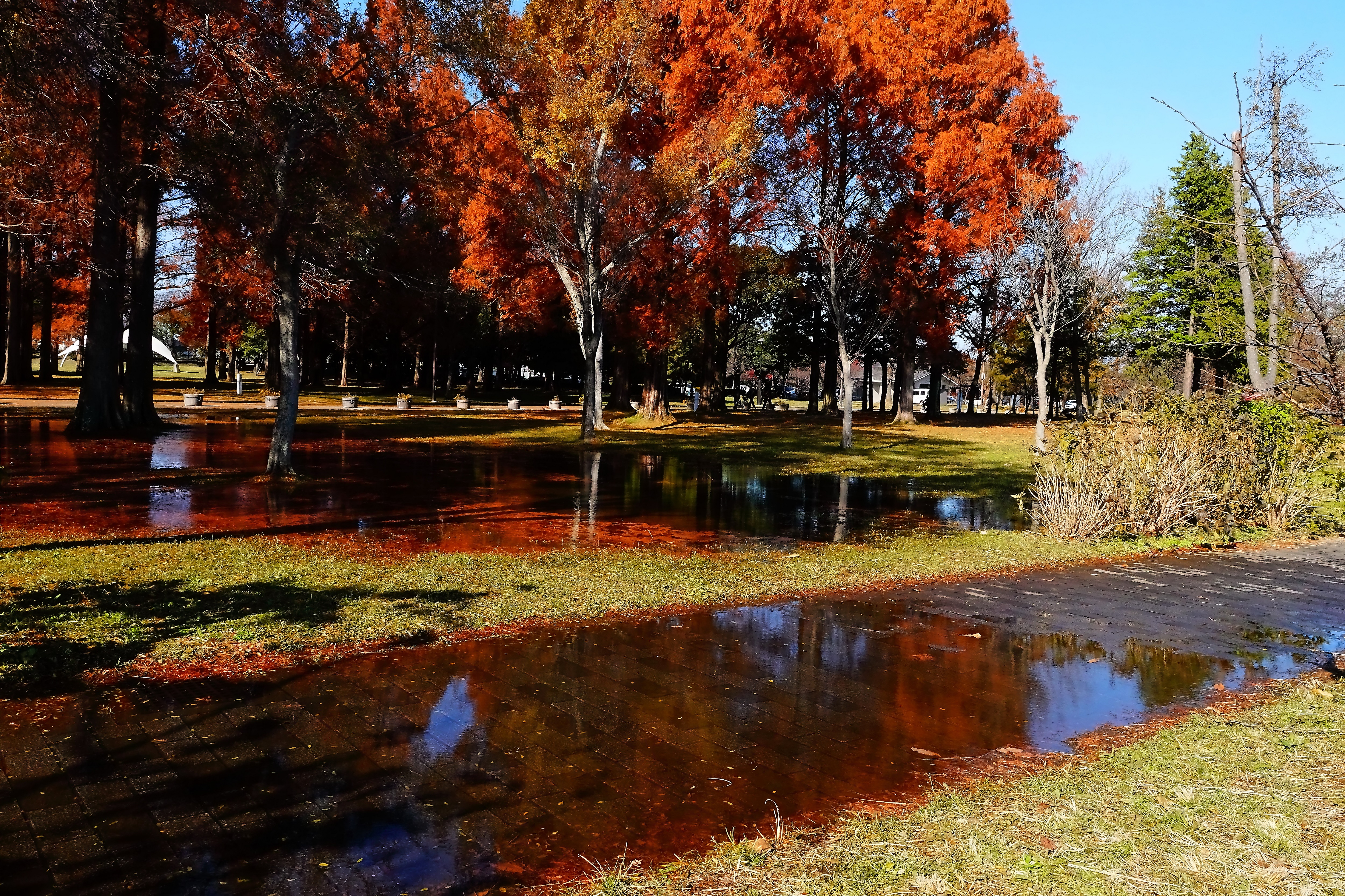 ちょうど美しく紅葉したラクウショウが手前の遊歩道まで映り込んでくれました。