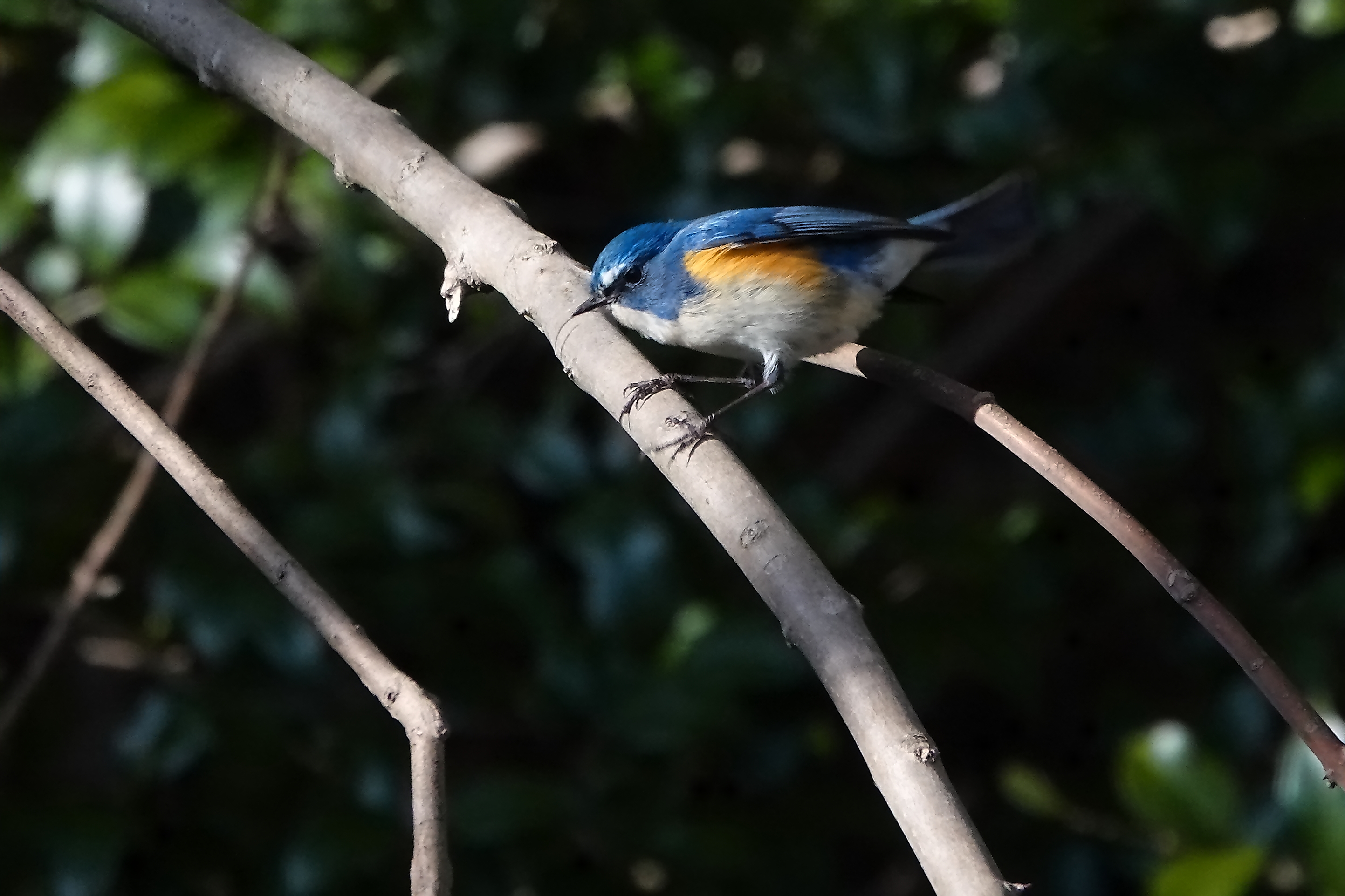 前作「羽搏くルリビタキ」の目の前の太い枝にいきなり飛びつきました。流石俊敏です。