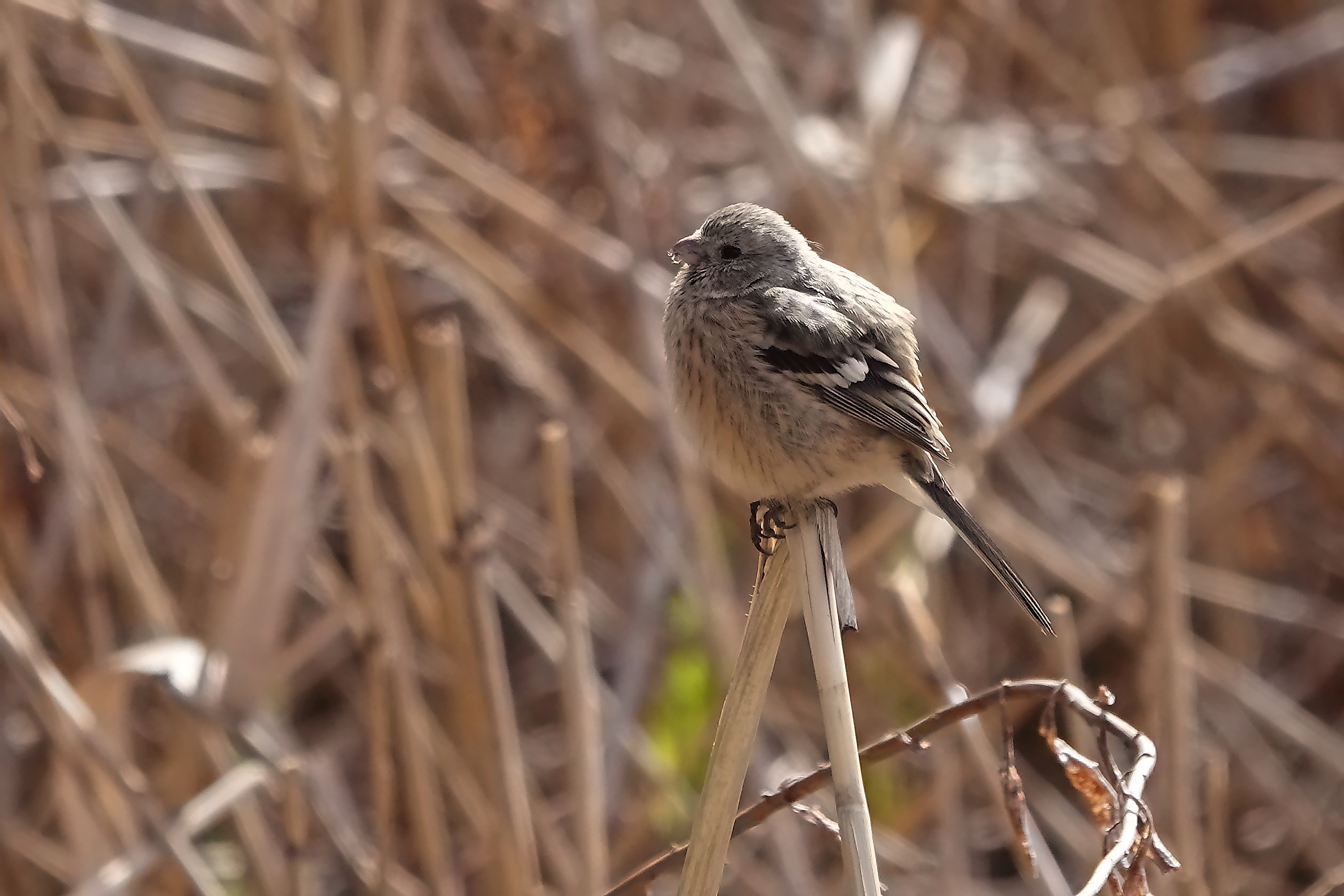 ポカポカ陽気で気持ちがいいのか、ダルマさんのように真ん丸になって暫しお休み中のベニマシコの雌。