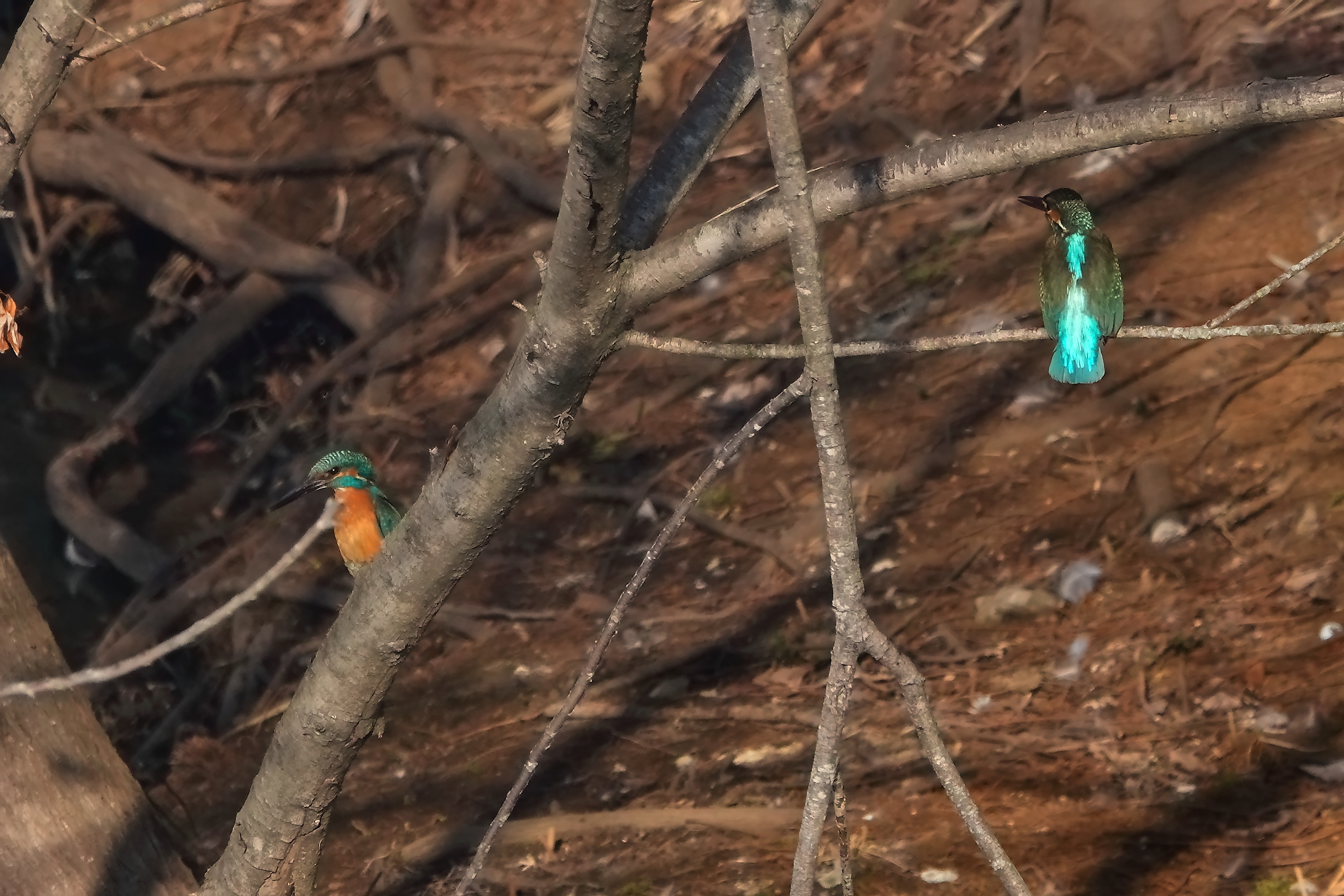 右のカワセミの雌が止まっていた真下を雄が通り過ぎてすぐ左の枝に止まりました。雄の顔は横を向いていますが、とても雌が気になるようです。右の雌もやはり様子を覗っています。