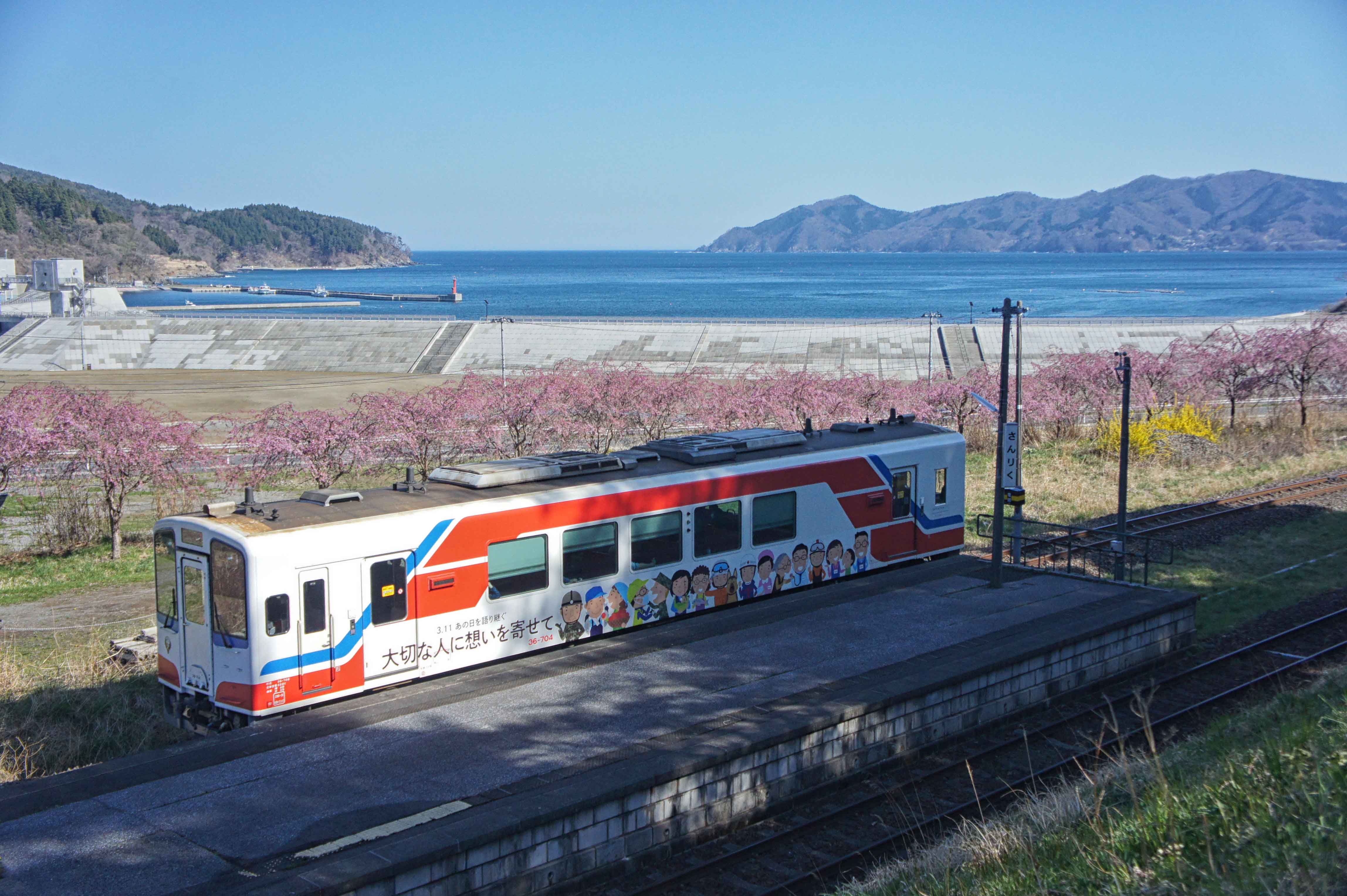 青空×海(水平線)×桜×三鉄。フィルター使いました。三陸鉄道リアス線、三陸駅付近にて。