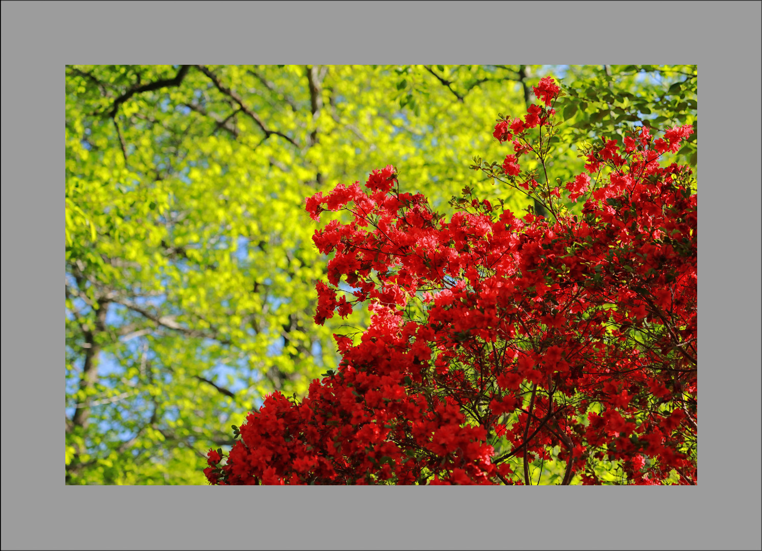 新緑と赤色躑躅