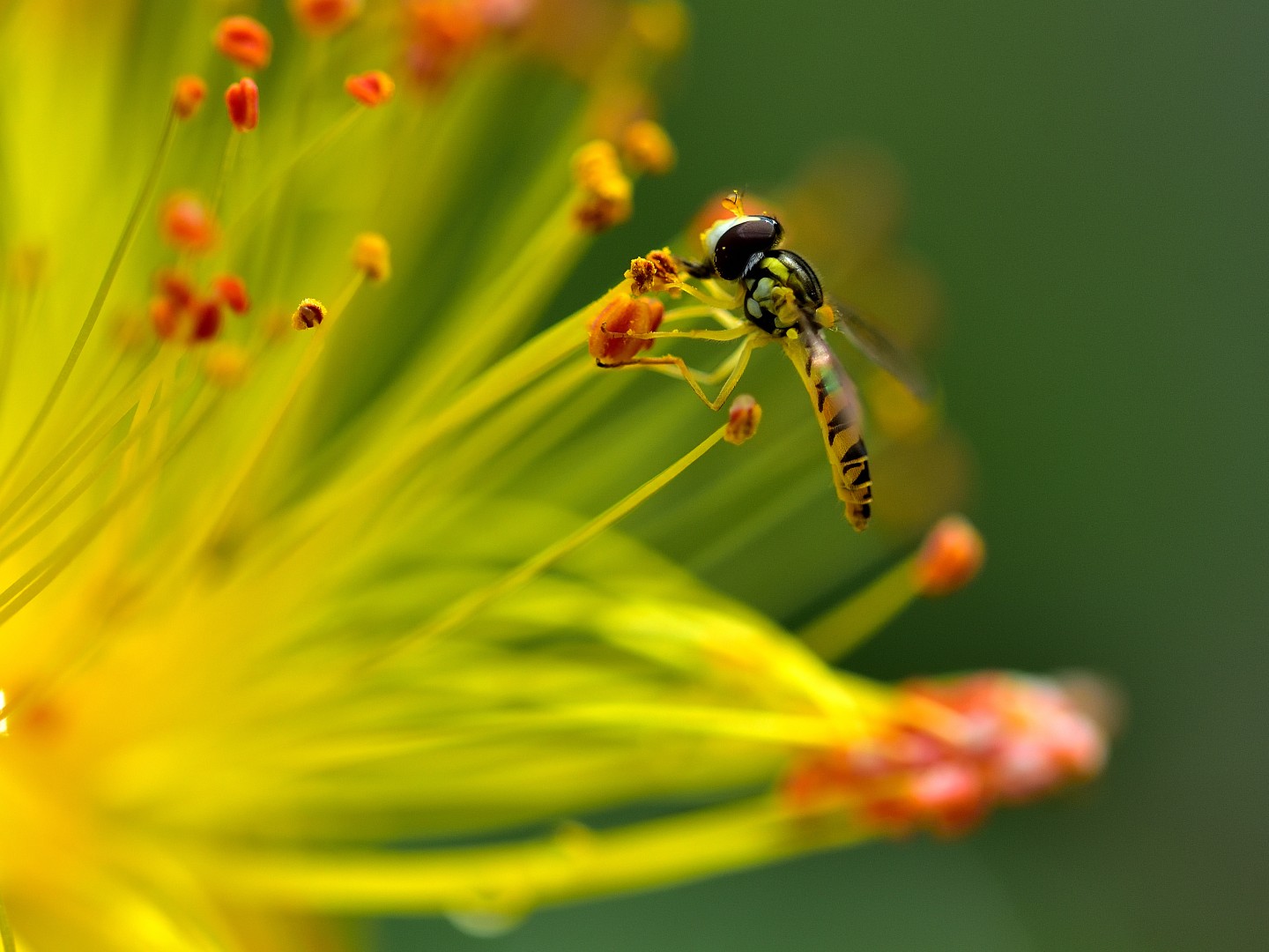 ヒペリカムのシベの森に迷い込んだようなハナアブくん