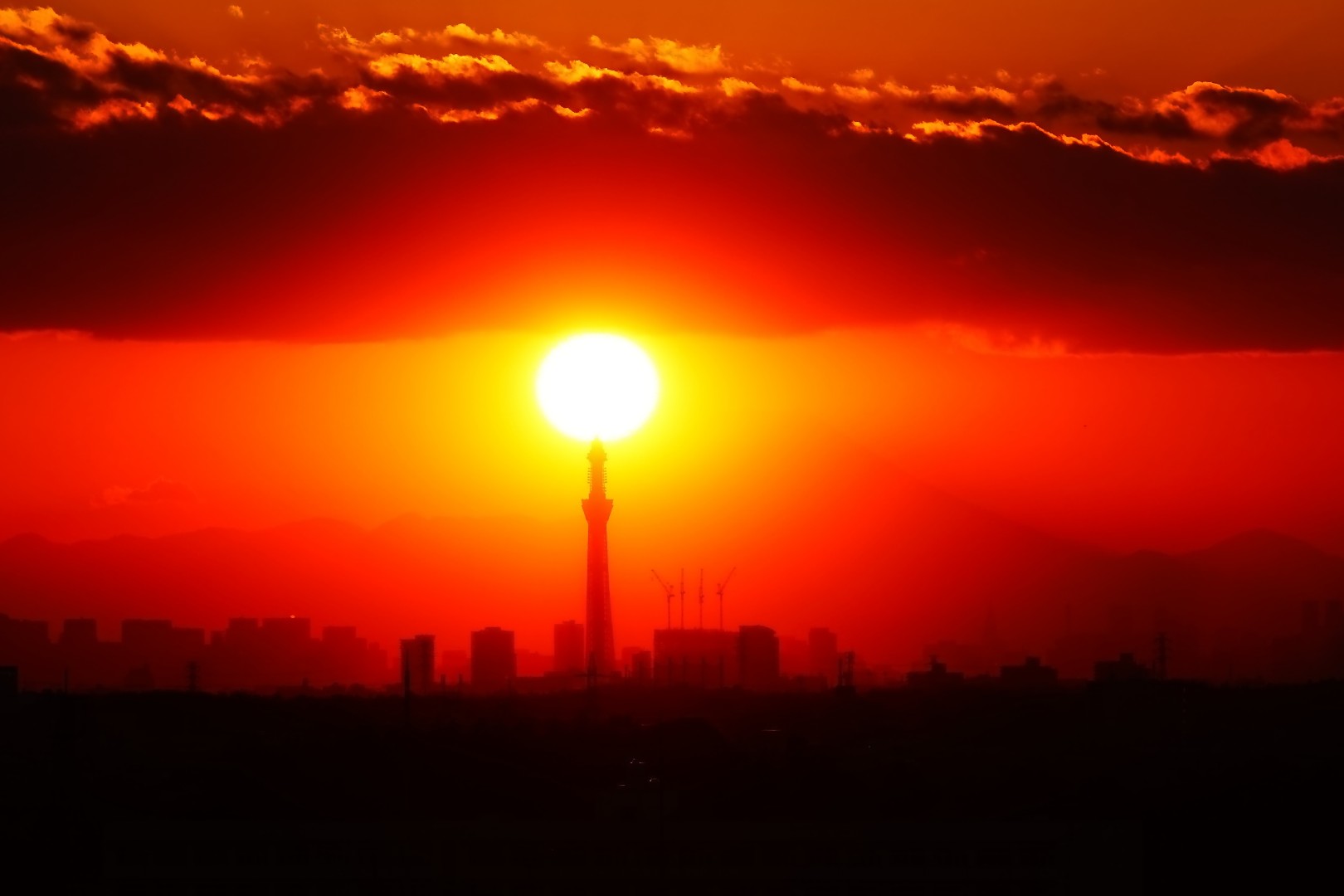 東京スカイツリーに夕陽が重なって灯りが点り、