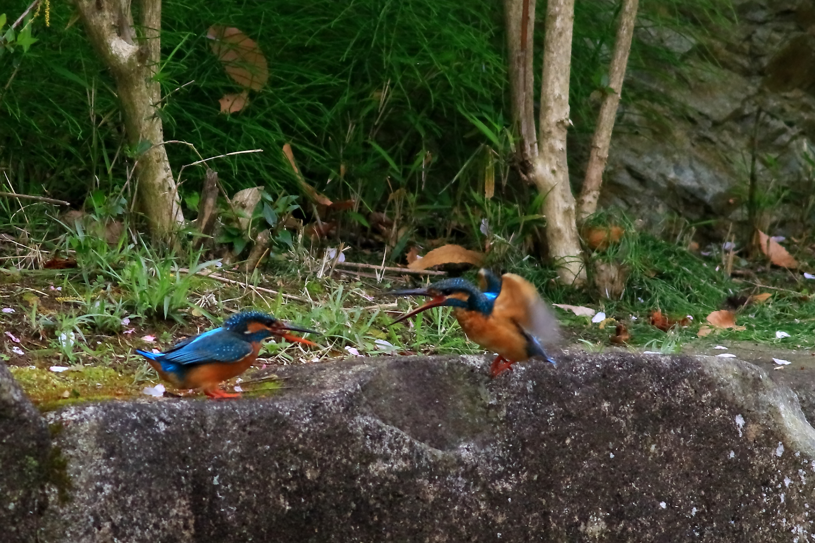 石の上で待つ雌カワセミ(左)の前に勢いよく飛んで来た雄ですが、狩りに失敗で手ぶらです。