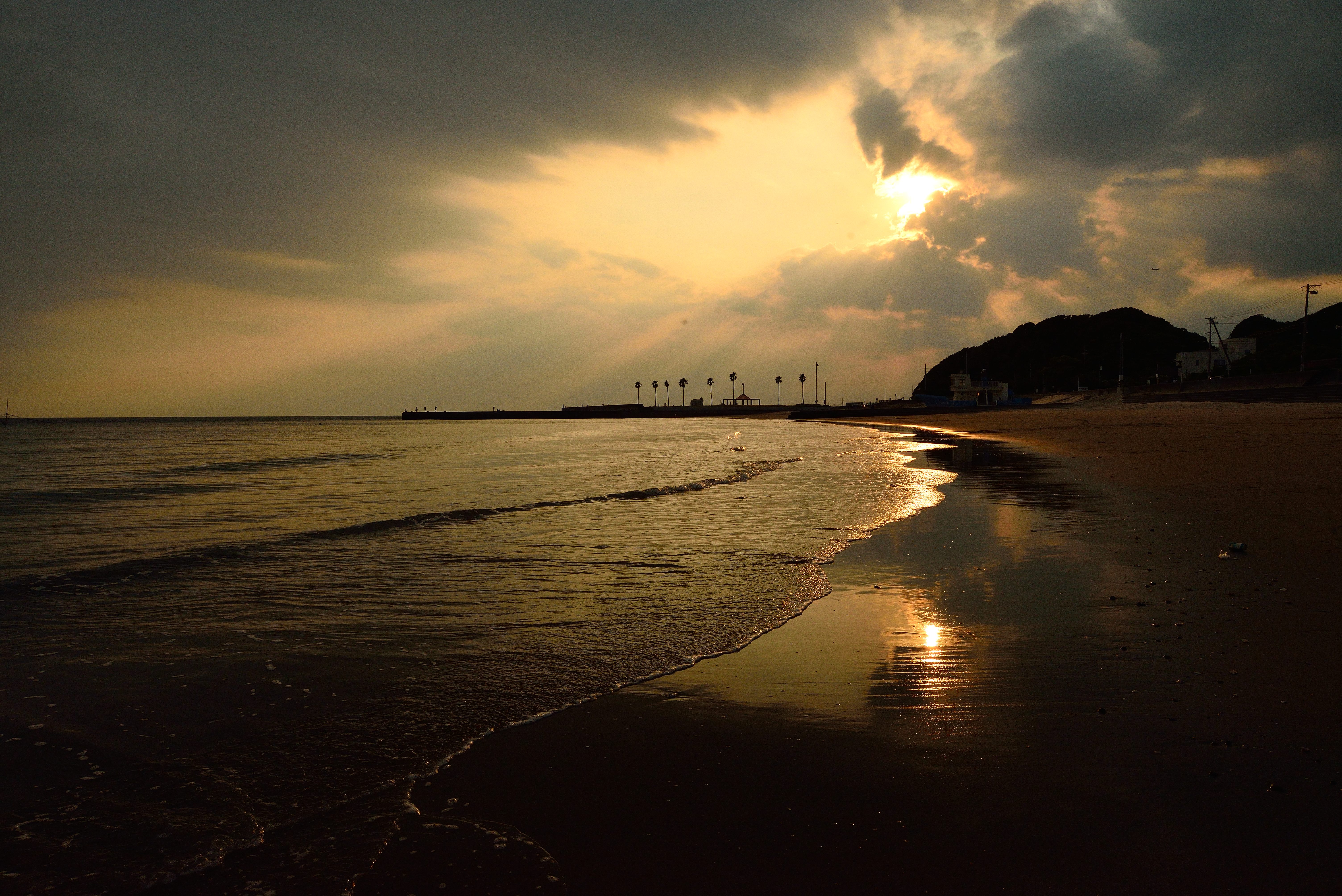 タグにもありますが、浜辺に映り込んだ夕日や、それに遠慮しているかのような雲の配置などとても良いです^^