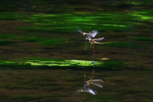 水草に止まって産卵