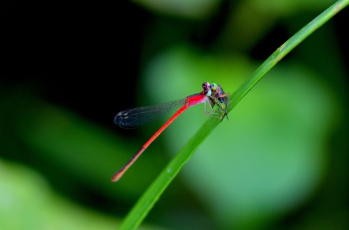 小さなハエを捕えたコフキヒメイトトンボ ♀(未成熟)