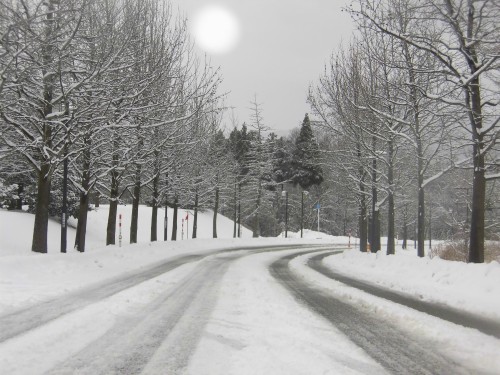 神秘的な冬の太陽と滝、「水面に光りの絵を描く」