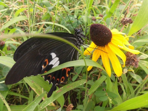 黄花に止まる黒蝶
