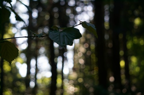 雨上がり、山奥の森で木漏れ日