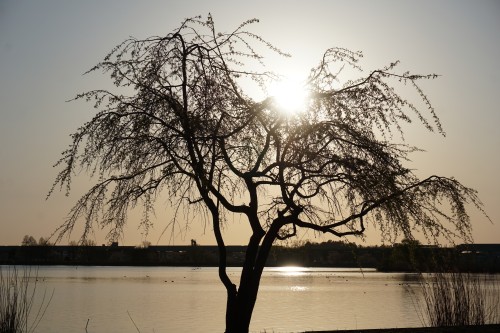 夕日に照らされる一本桜