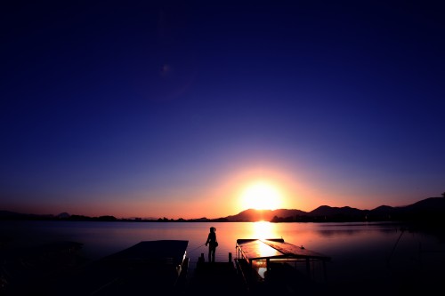 湖畔を染める夕日