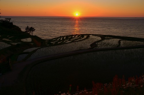 夕日と棚田