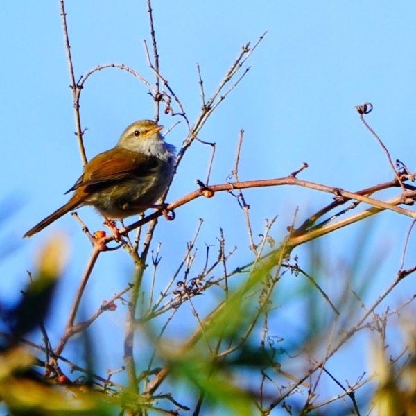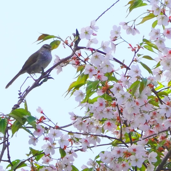 青空バックで囀る鶯