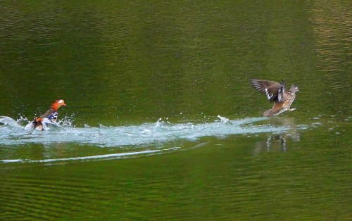 追いかけるオシドリの雄